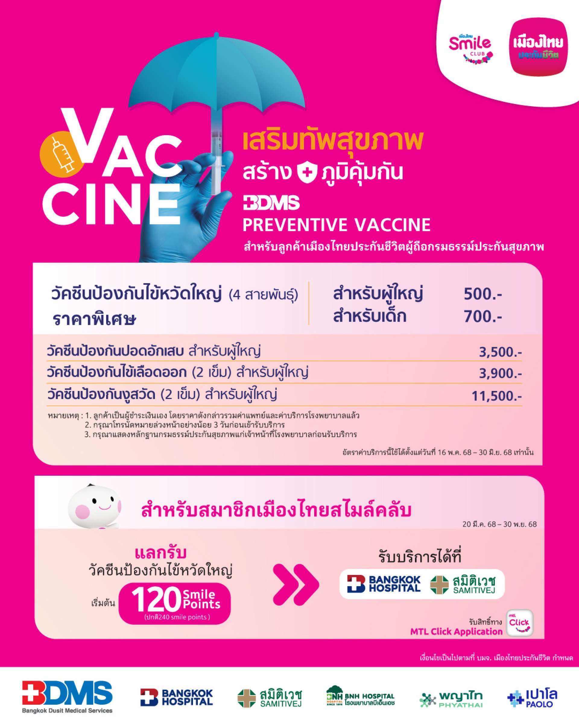 นอกจากนี้ เมืองไทยประกันชีวิตยังได้ร่วมแคมเปญ BDMS PREVENTIVE VACCINE มอบสิทธิพิเศษสำหรับผู้ถือกรมธรรม์ประกันสุขภาพ รับวัคซีนในราคาสุดพิเศษ (รวมค่าแพทย์) ครอบคลุม 4 กลุ่มโรคหลัก ได้แก่ วัคซีนป้องกันโรคไข้หวัดใหญ่ 4 สายพันธุ์ สำหรับผู้ใหญ่ราคา 500 บาท และเด็ก ราคา 700 บาท วัคซีนป้องกันโรคปอดอักเสบ สำหรับผู้ใหญ่ ราคา 3,500 บาท วัคซีนป้องกันโรคไข้เลือดออกสำหรับผู้ใหญ่ (2 เข็ม) รวมราคา 3,900 บาท และวัคซีนป้องกันโรคงูสวัดสำหรับผู้ใหญ่ (2 เข็ม) รวมราคา 11,500 บาท โดยผู้ถือกรมธรรม์ประกันสุขภาพของเมืองไทยประกันชีวิต สามารถแสดงหลักฐานเพื่อเข้ารับบริการได้ ณ โรงพยาบาลในเครือ BDMS ทั่วประเทศ ตั้งแต่วันที่ 16 พฤษภาคม 2568 30 มิถุนายน 2568 โดยผู้ที่สนใจสามารถสอบถามรายละเอียดเพิ่มเติม ได้ที่โรงพยาบาลในเครือ BDMS ทั่วประเทศ