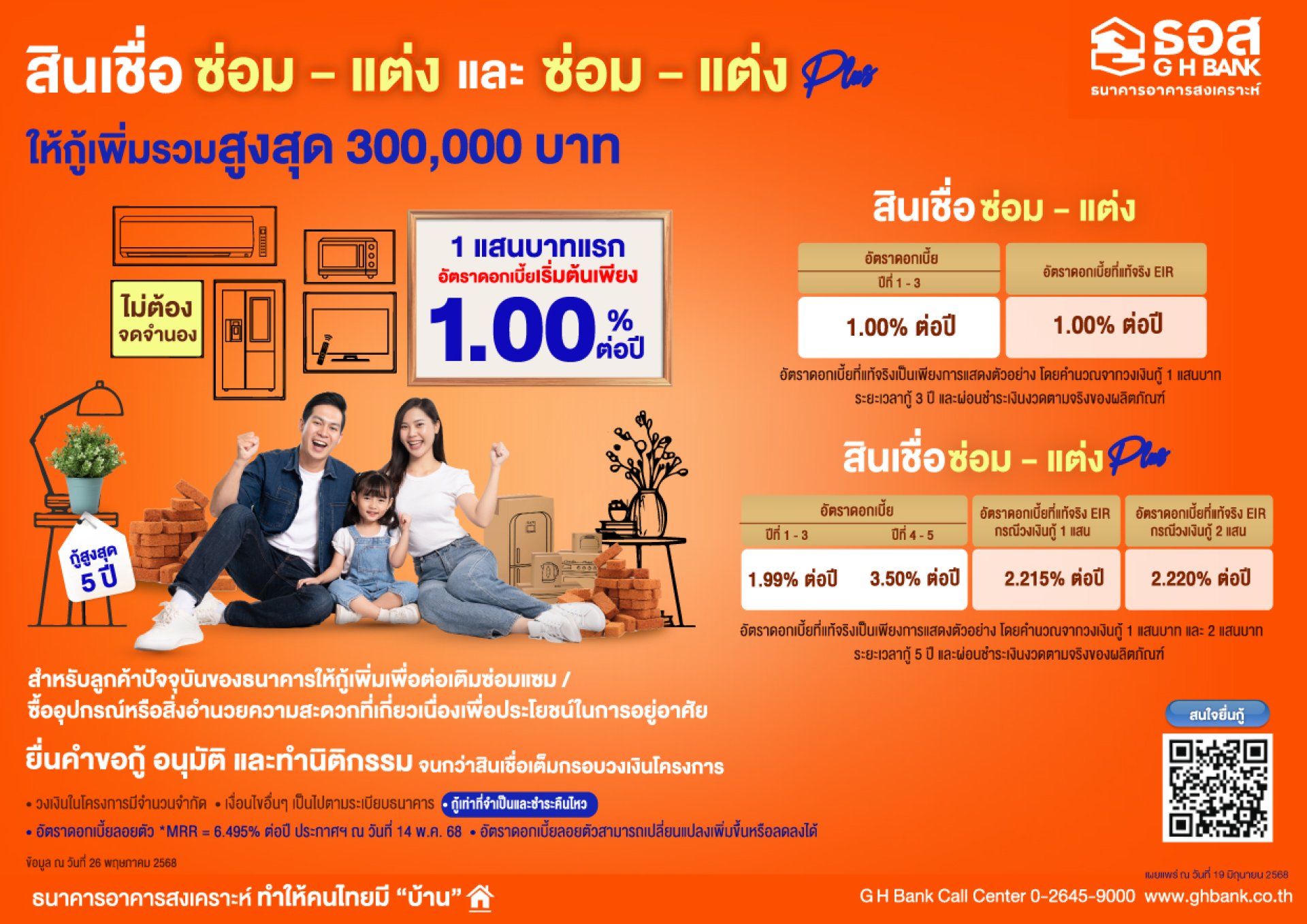 ธอส. เพิ่มสภาพคล่องให้ลูกค้าต่อเติมบ้านในฝันกับ สินเชื่อซ่อม - แต่ง และสินเชื่อซ่อม - แต่ง Plus อัตราดอกเบี้ยพิเศษเริ่มต้นเพียง 1.00% ต่อปี