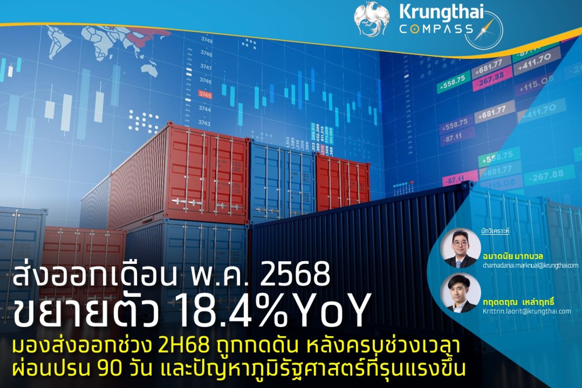 ส่งออกเดือน พ.ค. 2568ขยายตัว 18.4%YoY มองส่งออกช่วง 2H68 ถูกกดดัน หลังครบช่วงเวลาผ่อนปรน 90 วัน และปัญหาภูมิรัฐศาสตร์ที่รุนแรงขึ้น