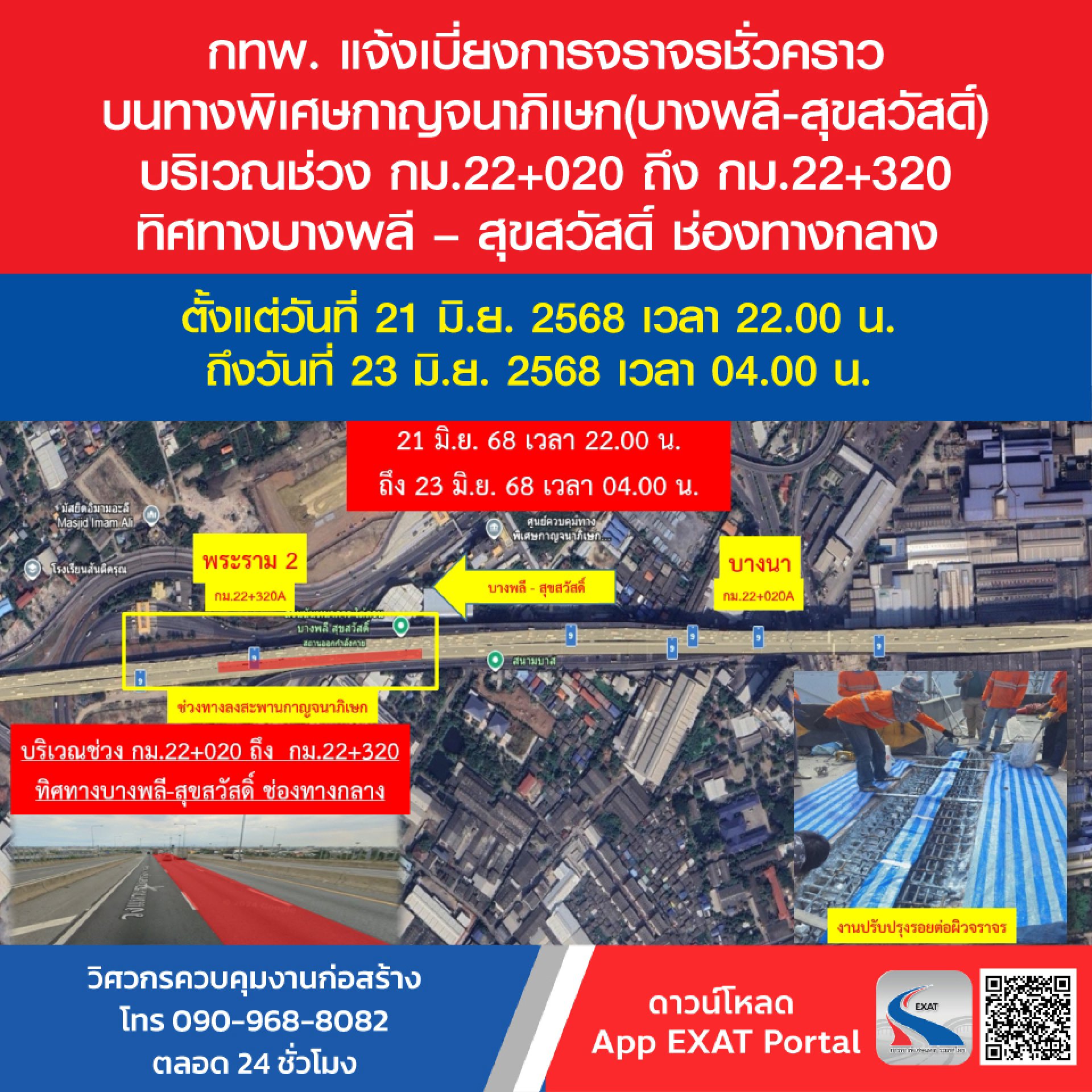 การทางพิเศษแห่งประเทศไทย (กทพ.) กระทรวงคมนาคม ได้ว่าจ้าง บริษัท ไทยวัฒน์วิศวการทาง จํากัด เป็นผู้รับจ้างดําเนินงานปรับปรุงผิวจราจรและรอยต่อทางพิเศษกาญจนาภิเษก (บางพลี - สุขสวัสดิ์) โดยผู้รับจ้าง จะเข้าดำเนินการปรับปรุงผิวจราจร และรอยต่อทางพิเศษกาญจนาภิเษก (บางพลี - สุขสวัสดิ์) จึงมีความจำเป็นจะต้องเบี่ยงการจราจรชั่วคราวบนทางพิเศษดังกล่าว บริเวณช่วง กม.22+020 ถึง กม.22+320 ทิศทางบางพลี สุขสวัสดิ์ ช่องทางกลาง ตั้งแต่วันที่ 21 มิ.ย. 2568 เวลา 22.00 น. ถึงวันที่ 23 มิ.ย. 2568 เวลา 04.00 น.
