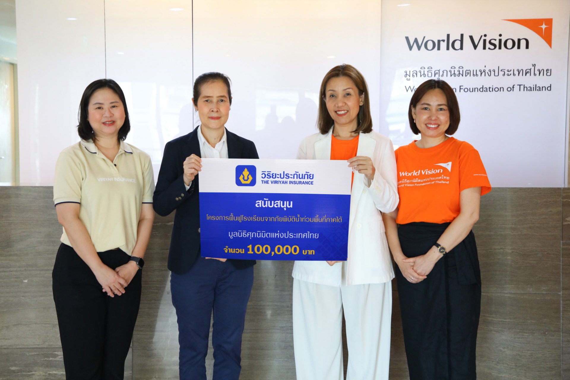 นางรสลิน โกแวร์ ผู้อำนวยการมูลนิธิศุภนิมิตแห่งประเทศไทย (World Vision Foundation of Thailand) รับมอบงบประมาณจำนวน 100,000 บาท จาก บริษัท วิริยะประกันภัย จำกัด (มหาชน) โดย นางชลทิชา สัตยมานะ ผู้ช่วยผู้จัดการฝ่ายสื่อสารองค์กร เป็นผู้แทนมอบ ภายใต้ โครงการฟื้นฟูโรงเรียนที่ได้รับผลกระทบจากน้ำท่วมภาคใต้ ซึ่งงบประมาณดังกล่าว จะถูกนำไปสนับสนุนการจัดซื้อจัดหาครุภัณฑ์และอุปกรณ์การเรียนการสอนให้กับโรงเรียนบ้านศรีพงัน อ.ตากใบ จ.นราธิวาส และโรงเรียนบ้านม่วงถ้ำ อ.เทพา จ.สงขลา เพื่อสนับสนุนการปรับปรุงซ่อมแซมห้องเรียนที่ได้รับความเสียหายจากภัยพิบัติน้ำท่วมรุนแรง ให้กลับมาสู่สภาพที่พร้อมสำหรับการจัดการเรียนการสอนได้อย่างปกติ โดยพิธีมอบจัดขึ้น ณ มูลนิธิศุภนิมิตแห่งประเทศไทย แขวงสามเสนนอก เขตห้วยขวาง กรุงเทพฯ