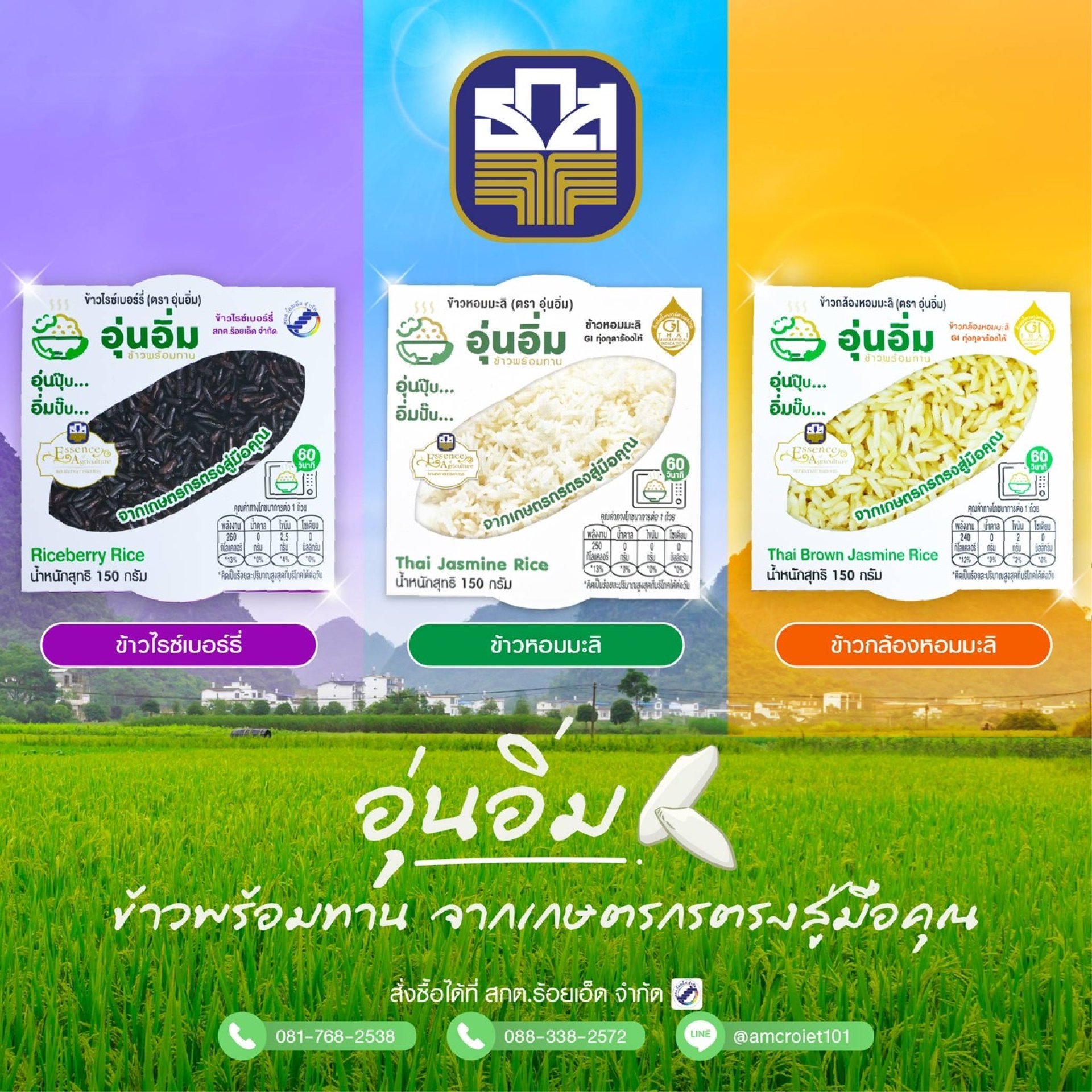 ได้มาตรฐาน สามารถรับประทานได้ทันที หรืออุ่นในไมโครเวฟเพียง 60 วินาที เพื่อเพิ่มความอร่อยยิ่งขึ้น และยังสามารถเก็บในอุณหภูมิห้องได้นานถึง 18 เดือน โดยไม่จำเป็นต้องเก็บไว้ในตู้เย็น รวมถึงยังได้ออกแบบบรรจุภัณฑ์ให้มีความโดดเด่น สวยงาม น่ารับประทาน หลังจากนั้น ธ.ก.ส. ได้เข้าไปสนับสนุนการต่อยอดผลิตภัณฑ์ด้วยการนำข้าวกล้องหอมมะลิและข้าวไรซ์เบอร์รีมาแปรรูปเป็นข้าว อุ่นอิ่ม เพื่อสร้างความหลากหลายให้กับผลิตภัณฑ์และตอบโจทย์การใช้ชีวิตของผู้บริโภคยุคปัจจุบันที่สนใจในการรับประทานอาหารเพื่อสุขภาพ โดยนับตั้งแต่ สกต.ร้อยเอ็ด เริ่มเปิดจำหน่ายข้าวพร้อมทานตรา อุ่นอิ่ม ทั้งประเภทข้าวหอมมะลิ ข้าวกล้อง และข้าวไรซ์เบอร์รี ตั้งแต่เดือนกันยายน 2567 ถึงปัจจุบัน มียอดส่งจำหน่ายได้แล้วมากกว่า 40,000 ถ้วย คิดเป็นมูลค่ากว่า 1.8 ล้านบาท และเตรียมขยายตลาดไปยังกลุ่มผู้บริโภคในหัวเมืองใหญ่ และกลุ่มนักท่องเที่ยวชาวไทยที่สามารถนำข้าวอุ่นอิ่มพกพาเดินทางไปทานระหว่างท่องเที่ยวทั้งในประเทศและต่างประเทศได้อีกด้วย