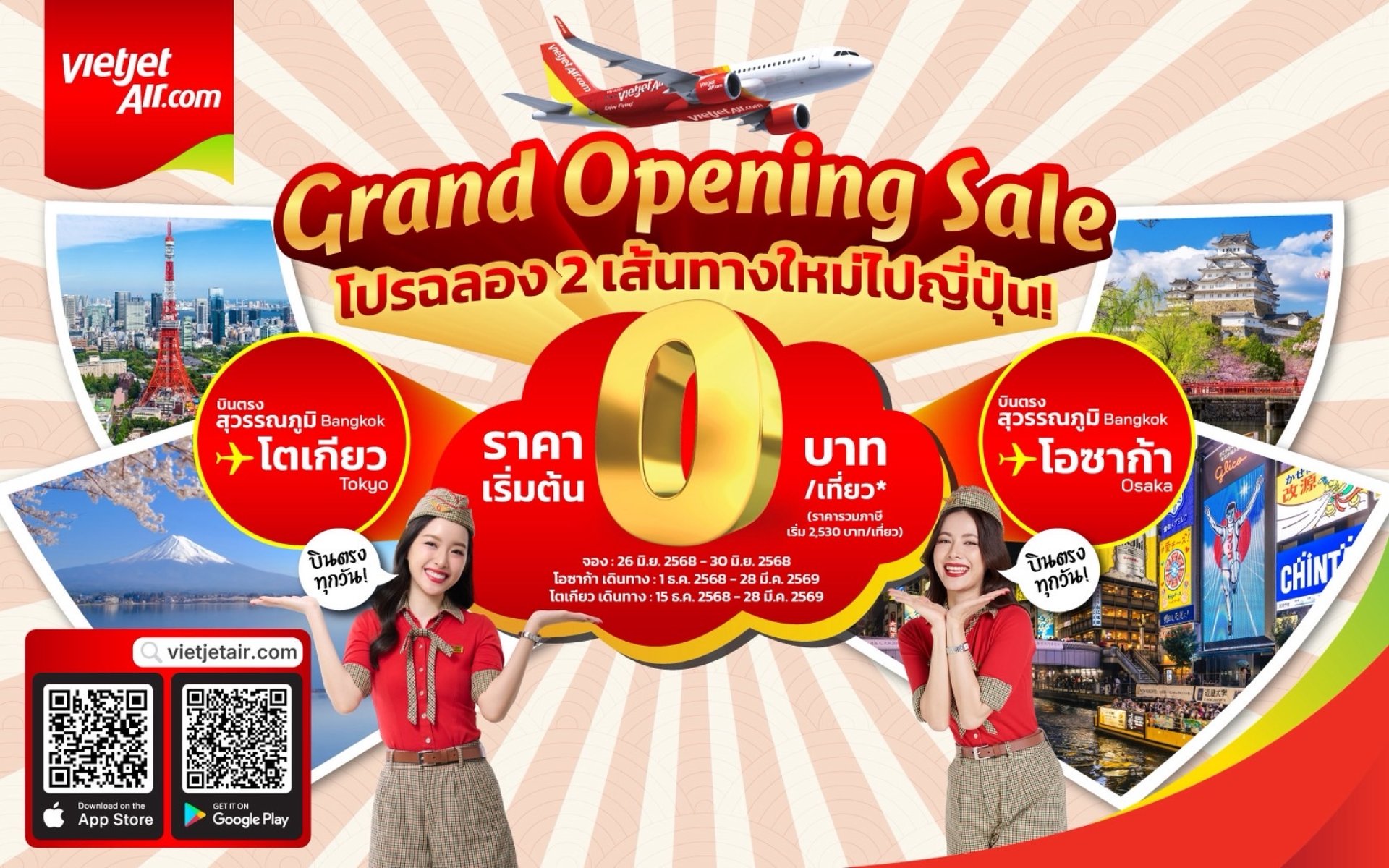 เวียตเจ็ทไทยแลนด์ เปิดเส้นทางบินตรงสู่โตเกียว และ โอซาก้า ตั๋วโปรฯ เริ่มต้น 0 บาท