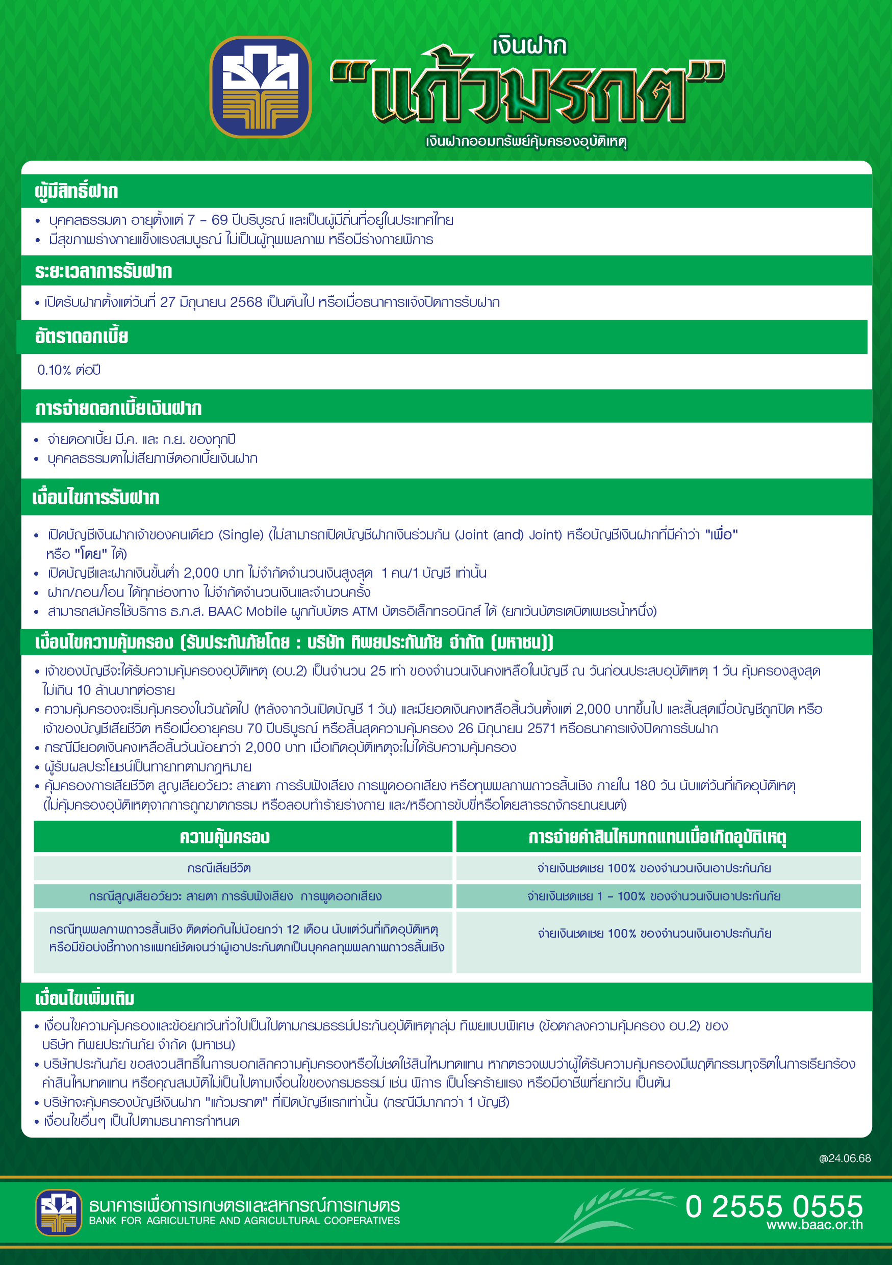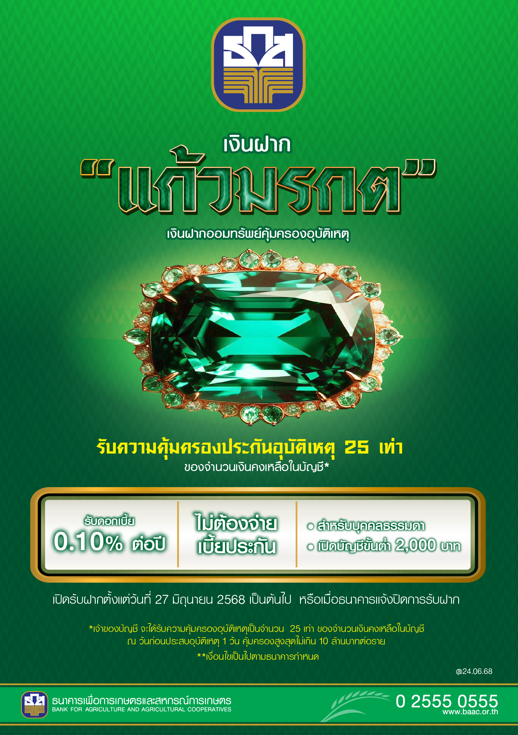 นายไพศาล หงษ์ทอง รองผู้จัดการ ธนาคารเพื่อการเกษตรและสหกรณ์การเกษตร (ธ.ก.ส.) เปิดเผยว่า เพื่อเป็นการเสริมสร้างพฤติกรรมการออมเงินระยะยาวอย่างต่อเนื่องและร่วมสร้างภูมิคุ้มกันทางการเงินให้กับคนไทยอย่างยั่งยืน ธ.ก.ส. เปิดตัวผลิตภัณฑ์เงินฝากแก้วมรกต ออมง่ายแถมได้รับความคุ้มครอง เปิดบัญชีและฝากเงินเริ่มต้นเพียง 2,000 บาทขึ้นไป โดยไม่จำกัดวงเงินฝากสูงสุด (1 คนต่อบัญชี) รับผลตอบแทนเป็นดอกเบี้ยเงินฝากในอัตราร้อยละ 0.10 ต่อปี โดยจ่ายดอกเบี้ยทุกเดือนมีนาคมและกันยายน พร้อมรับสิทธิประโยชน์ความคุ้มครองประกันอุบัติเหตุ (อบ.2) กรณีเสียชีวิต สูญเสียอวัยวะ สายตา การรับฟังเสียง การพูดออกเสียง หรือทุพพลภาพถาวรสิ้นเชิงสูงถึง 25 เท่าของยอดเงินฝากคงเหลือไม่ต่ำกว่า 2,000 บาท ก่อนเกิดเหตุ 1 วัน วงเงินคุ้มครองสูงสุดไม่เกิน 10 ล้านบาท โดยรับความคุ้มครองหลังจากเปิดบัญชี 1 วัน สิ้นสุดความคุ้มครอง 26 มิ.ย. 2571 ไม่มีค่าใช้จ่ายด้านเบี้ยประกัน ทั้งนี้ ผู้มีสิทธิ์เปิดบัญชีต้องเป็นบุคคลธรรมดาที่มีสุขภาพแข็งแรงและมีถิ่นที่อยู่ในประเทศไทย อายุตั้งแต่ 7 69 ปีบริบูรณ์ กรณีมียอดเงินคงเหลือต่ำกว่ากำหนดจะไม่ได้รับความคุ้มครอง และความคุ้มครองจะสิ้นสุดเมื่อบัญชีถูกปิด เจ้าของบัญชีเสียชีวิต หรือเมื่ออายุครบ 70 ปีบริบูรณ์ หรือเมื่อธนาคารปิดการรับฝาก