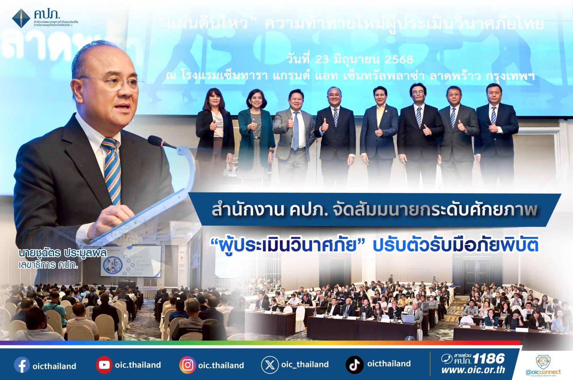 นายชูฉัตร ประมูลผล เลขาธิการคณะกรรมการกำกับและส่งเสริมการประกอบธุรกิจประกันภัย (เลขาธิการ คปภ.) เป็นประธานเปิดงานสัมมนาผู้ประเมินวินาศภัย ปี 2568 ณห้องวิภาวดีบอลรูม ซี โรงแรมเซ็นทาราแกรนด์ แอท เซ็นทรัลพลาซา ลาดพร้าว กรุงเทพฯโดยมี นางสาววสุมดี วสีนนท์ รองเลขาธิการ ด้านกำกับคนกลางและประกันภัยภูมิภาค ผู้บริหารสำนักงาน คปภ. ผู้บริหารสมาคม ผู้ประเมินวินาศภัย และสมาคมการค้าผู้สำรวจและประเมินวินาศภัยไทย ผู้ตรวจสอบและประเมินวินาศภัย เข้าร่วมงานกว่า 200 คน