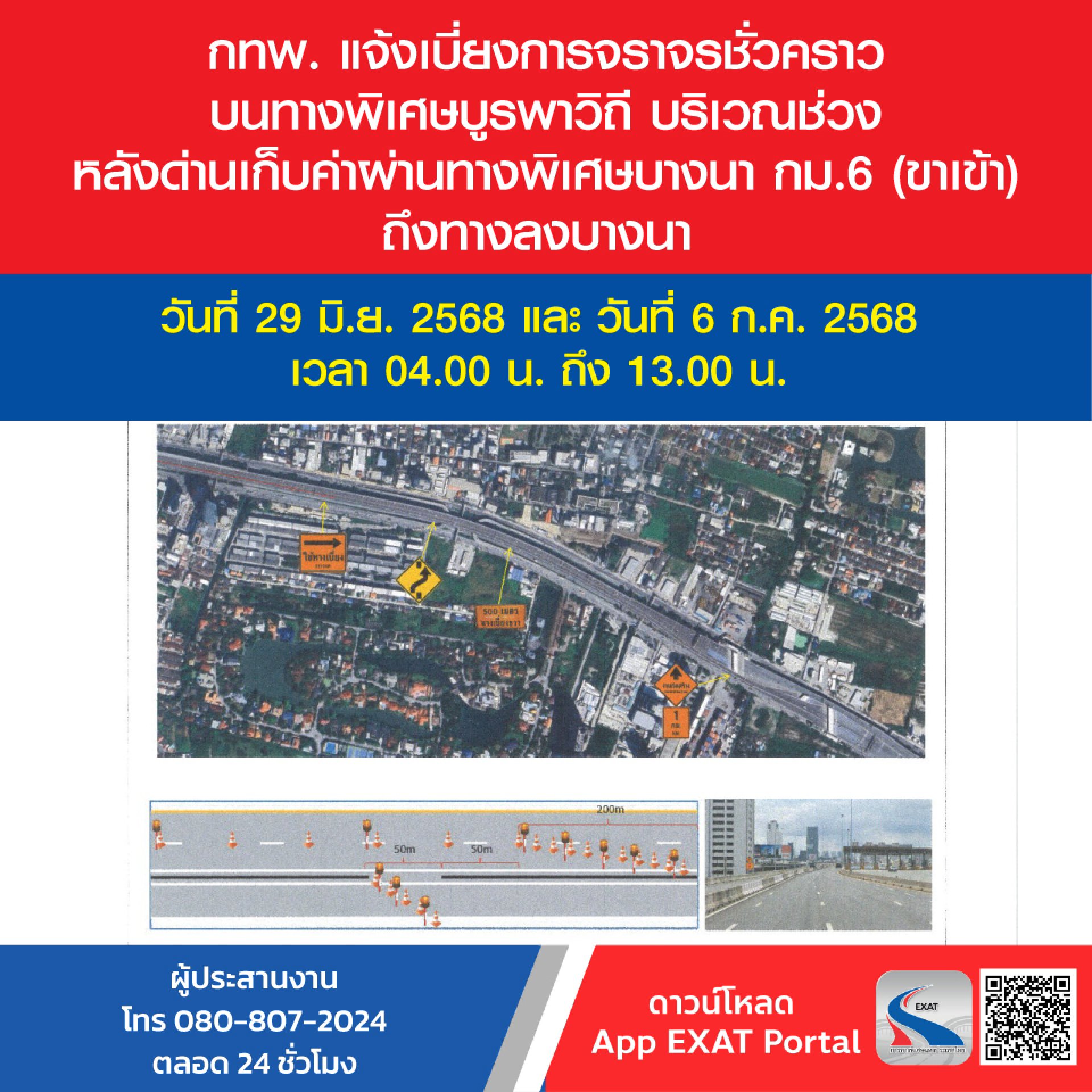 การทางพิเศษแห่งประเทศไทย (กทพ.) กระทรวงคมนาคม ได้ว่าจ้าง การไฟฟ้านครหลวง (กฟน.) เป็นผู้รับจ้างดำเนินงานปรับปรุงตู้จ่ายไฟฟ้า ทางพิเศษบูรพาวิถี โดยผู้รับจ้างจะเข้าดำเนินการงานปรับปรุงตู้จ่ายไฟฟ้าดังกล่าว จึงมีความจำเป็นจะต้องปิดเบี่ยงการจราจรชั่วคราวบนทางพิเศษบูรพาวิถี บริเวณช่วงหลังด่านเก็บค่าผ่านทางพิเศษบางนา กม.6 (ขาเข้า) ถึงทางลงบางนา ในวันอาทิตย์ที่ 29 มิถุนายน 2568 และวันอาทิตย์ที่ 6 กรกฎาคม 2568 เวลา 04.00 น. ถึง 13.00 น.
