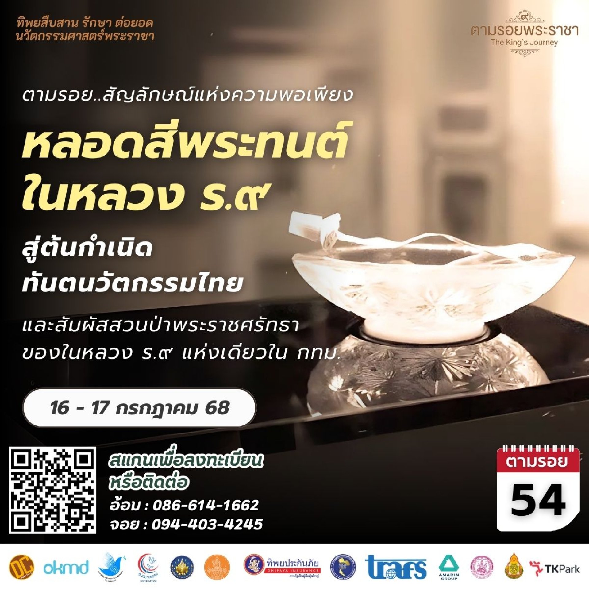 เชิญร่วมโครงการทิพยสืบสาน รักษา ต่อยอด นวัตกรรมศาสตร์พระราชา ครั้งที่ 54 ในวันที่ 16 17 กรกฎาคม 2568 ณ คณะทันตแพทยศาสตร์ จุฬาลงกรณ์มหาวิทยาลัย กรุงเทพมหานคร เปิดรับสมัครตั้งแต่วันนี้เป็นต้นไป สอบถามข้อมูลเพิ่มเติมที่ คุณพุทธชาด โทรศัพท์ 086 614 1662 FB : ตามรอยพระราชา-The Kings Journey