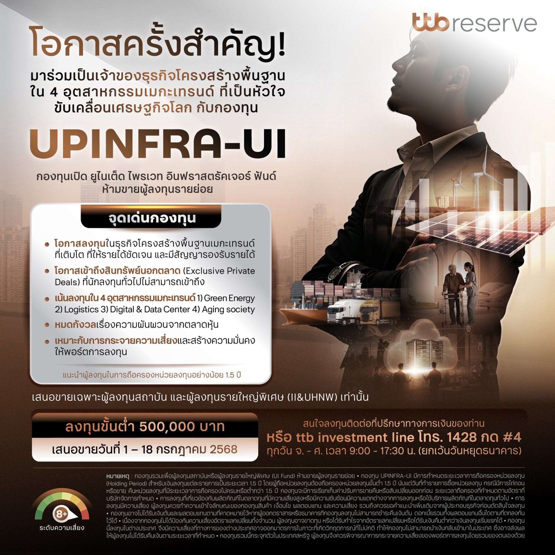 UPINFRA-UI เปิดเสนอขายสำหรับผู้ลงทุนสถาบันและรายใหญ่พิเศษ ห้ามขายผู้ลงทุนรายย่อย (UI Fund) เสนอขายครั้งแรก (IPO) วันที่ 1-18 กรกฎาคม 2568 เสนอขายเฉพาะผู้ลงทุนสถาบัน และ ผู้ลงทุนรายใหญ่พิเศษเท่านั้น (II&UHNW) ระดับความเสี่ยงกองทุน : ระดับ 8+ (ความเสี่ยงสูงมากอย่างมีนัยสำคัญ) มูลค่าขั้นต่ำของการลงทุน : 500,000 บาท