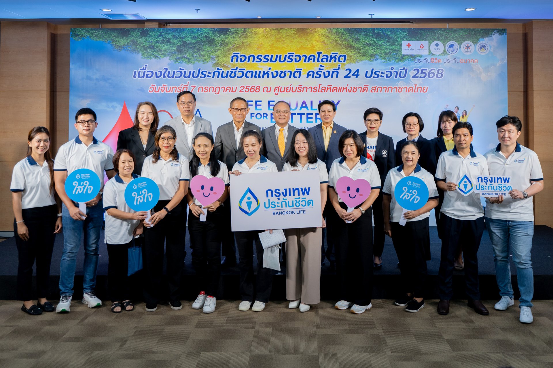 บริษัท กรุงเทพประกันชีวิต จำกัด (มหาชน) นำโดย นางสาวจารุวรรณ ลิ้มคุณธรรมโม ผู้ช่วยผู้จัดการใหญ่ สายบัญชีและการเงิน (ที่ 5 จากขวาล่าง) พร้อมด้วยพนักงานจิตอาสา สานต่อพันธกิจองค์กร ใส่ใจสังคม เข้าร่วมกิจกรรมบริจาคโลหิตเพื่อผู้ป่วยทั่วประเทศ เนื่องในวันประกันชีวิตแห่งชาติครั้งที่ 24 ประจำปี 2568 จัดโดยสำนักงานคปภ สมาคมประกันชีวิตไทย ที่จัดขึ้นเพื่อส่งเสริมการมีส่วนร่วมของภาคธุรกิจประกันชีวิตในการช่วยเหลือสังคมผ่านการบริจาคโลหิต ซึ่งเป็นโครงการที่กรุงเทพประกันชีวิตให้ความสำคัญและร่วมกิจกรรมเพื่อตอบแทนสังคมมาอย่างต่อเนื่องเป็นประจำทุกปี ณ ศูนย์บริการโลหิตแห่งชาติ สภากาชาดไทย เมื่อเร็ว ๆ นี้
