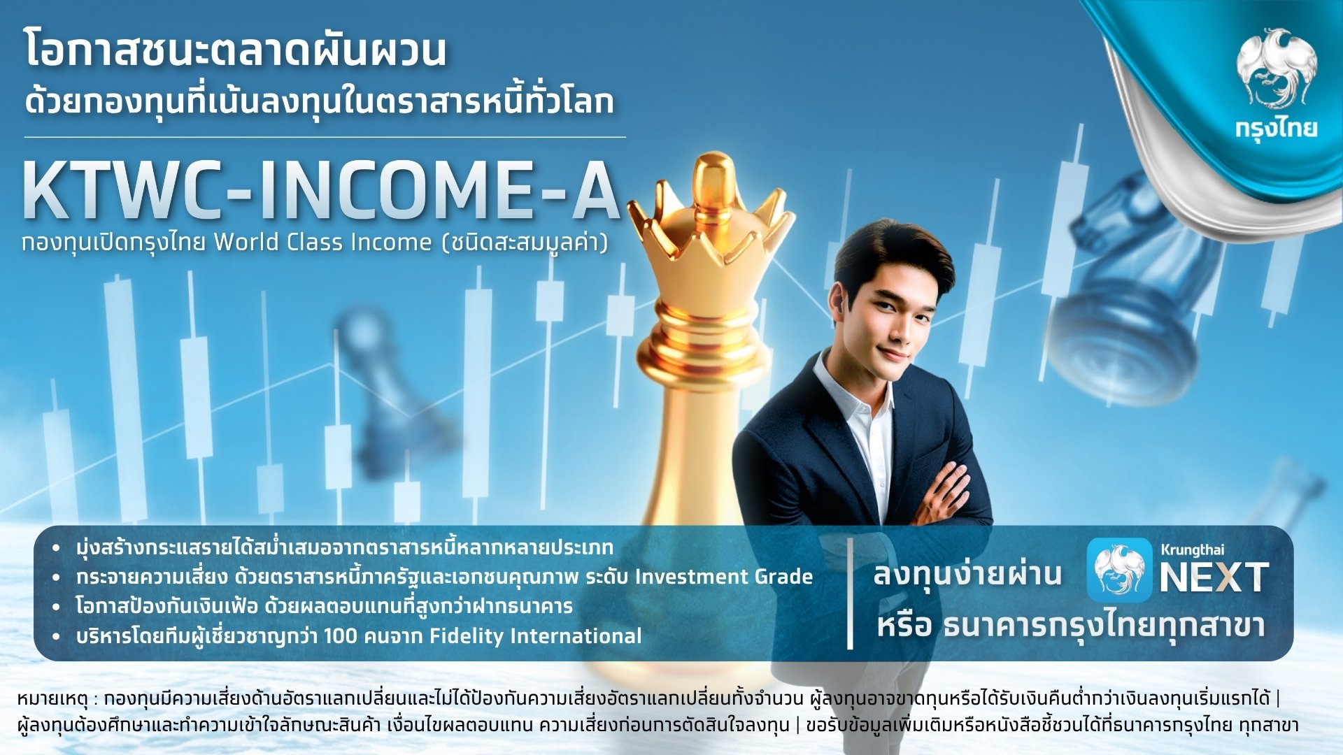 นายประมุข มาลาสิทธิ์ Head of Chief Investment Office ธนาคารกรุงไทย มองว่า ในช่วงที่ตลาดผันผวนสูง การกระจายการลงทุนในสินทรัพย์ที่ให้ผลตอบแทนมั่นคงถือเป็นทางเลือกที่น่าสนใจ โดย Krungthai World Class Income Fund (KTWC-INCOME-A) มุ่งเน้นการลงทุนในตราสารหนี้คุณภาพระดับ Investment Grade ทั่วโลก ทั้งพันธบัตรรัฐบาล หุ้นกู้เอกชน และสินทรัพย์ทางเลือก ภายใต้การบริหารโดย Fidelity International ผู้เชี่ยวชาญระดับโลก
