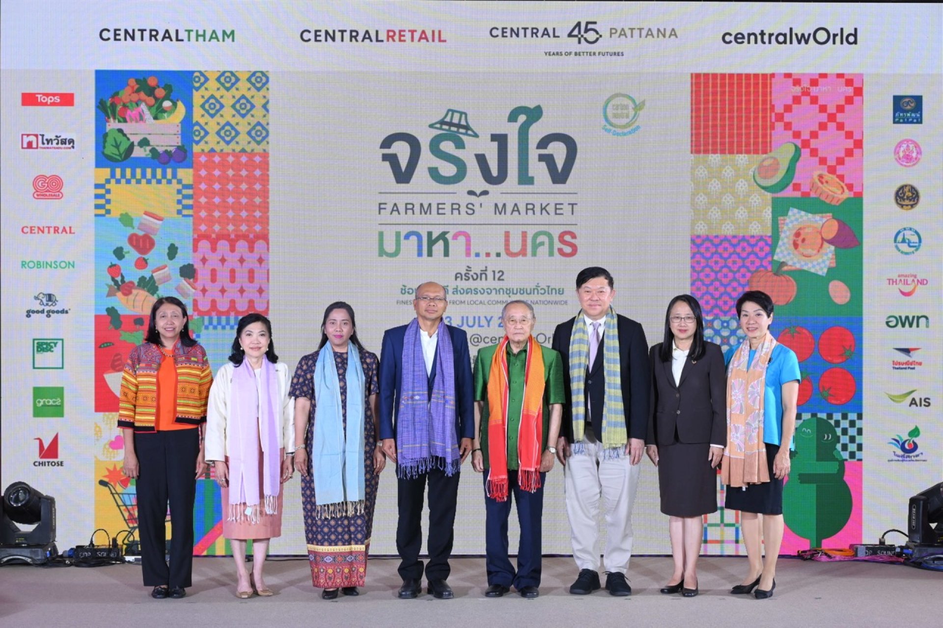 กลุ่มเซ็นทรัล นำโดย พิชัย จิราธิวัฒน์ กรรมการบริหาร กลุ่มเซ็นทรัล (ที่ 3 จากขวา), สุพัตรา จิราธิวัฒน์ ที่ปรึกษา กลุ่มเซ็นทรัล (ที่ 2 จากซ้าย) ปิยวรรณ ลีละสมภพ รองกรรมการผู้จัดการใหญ่ฝ่ายการตลาด บริษัท เซ็นทรัล รีเทล คอร์ปอเรชั่น จำกัด (มหาชน) (ขวา) ได้รับเกียรติจาก ดร. สุเมธ ตันติเวชกุล กรรมการและเลขาธิการ มูลนิธิชัยพัฒนา ประธานพิธีเปิดงาน (ที่4จากขวา) ) พร้อมด้วยผู้บริหารจากภาครัฐและเอกชน ได้แก่ อุดม ศรีสมทรง รองอธิบดีกรมการค้าภายใน กระทรวงพาณิชย์ (ที่ 4 จากซ้าย) วรรณภา เกียรติพงษา ผู้อำนวยการภูมิภาคภาคกลาง การท่องเที่ยวแห่งประเทศไทย (ที่ 3 จากซ้าย),วัชรี ชูรักษา ผู้ช่วยผู้อำนวยการ องค์การบริหารการพัฒนาพื้นที่พิเศษเพื่อการท่องเที่ยวอย่างยั่งยืน (องค์การมหาชน) (ซ้าย) และนภาพร เมฆาผ่องอำไพ ผู้ตรวจราชการกระทรวงการพัฒนาสังคมและความมั่นคงของมนุษย์ (ที่ 2 จากขวา) ร่วมเปิดงาน จริงใจ มาหา...นคร ช้อปของดีส่งตรงจากชุมชนทั่วไทย ซึ่งจัดขึ้นเป็นปีที่ 12 ภายใต้แนวคิด จริงใจกลางกรุง From Roots to Radiance เชื่อมต่อผู้บริโภคในเมืองกับเกษตรกรและผู้ผลิตจากชุมชนทั่วประเทศ ยกขบวนของดีประจำถิ่นกว่า 1,000 รายการ จาก 50 ชุมชน 47 จังหวัด ณ ศูนย์การค้าเซ็นทรัลเวิลด์ เมื่อวันก่อน