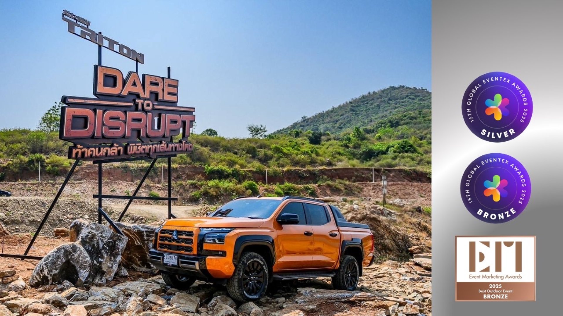 ท้าทาย และ Dare to Disrupt ท้าคนกล้า พิชิตทุกเส้นทางโหด โดยทั้ง 2 กิจกรรม สามารถคว้า 4 รางวัล อันทรงเกียรติจากสองเวทีการประกวดด้านการตลาดระดับโลก ได้แก่ Eventex Awards 2025 และ Event Marketing Awards 2025 ซึ่งความสำเร็จในครั้งนี้สะท้อนถึงความมุ่งมั่นในการถ่ายทอดสมรรถนะอันยอดเยี่ยมของผลิตภัณฑ์ผ่านกิจกรรมสุดท้าทายที่เปิดโอกาสให้ลูกค้าได้สัมผัสเทคโนโลยี และสมรรถนะของรถยนต์มิตซูบิชิอย่างแท้จริง