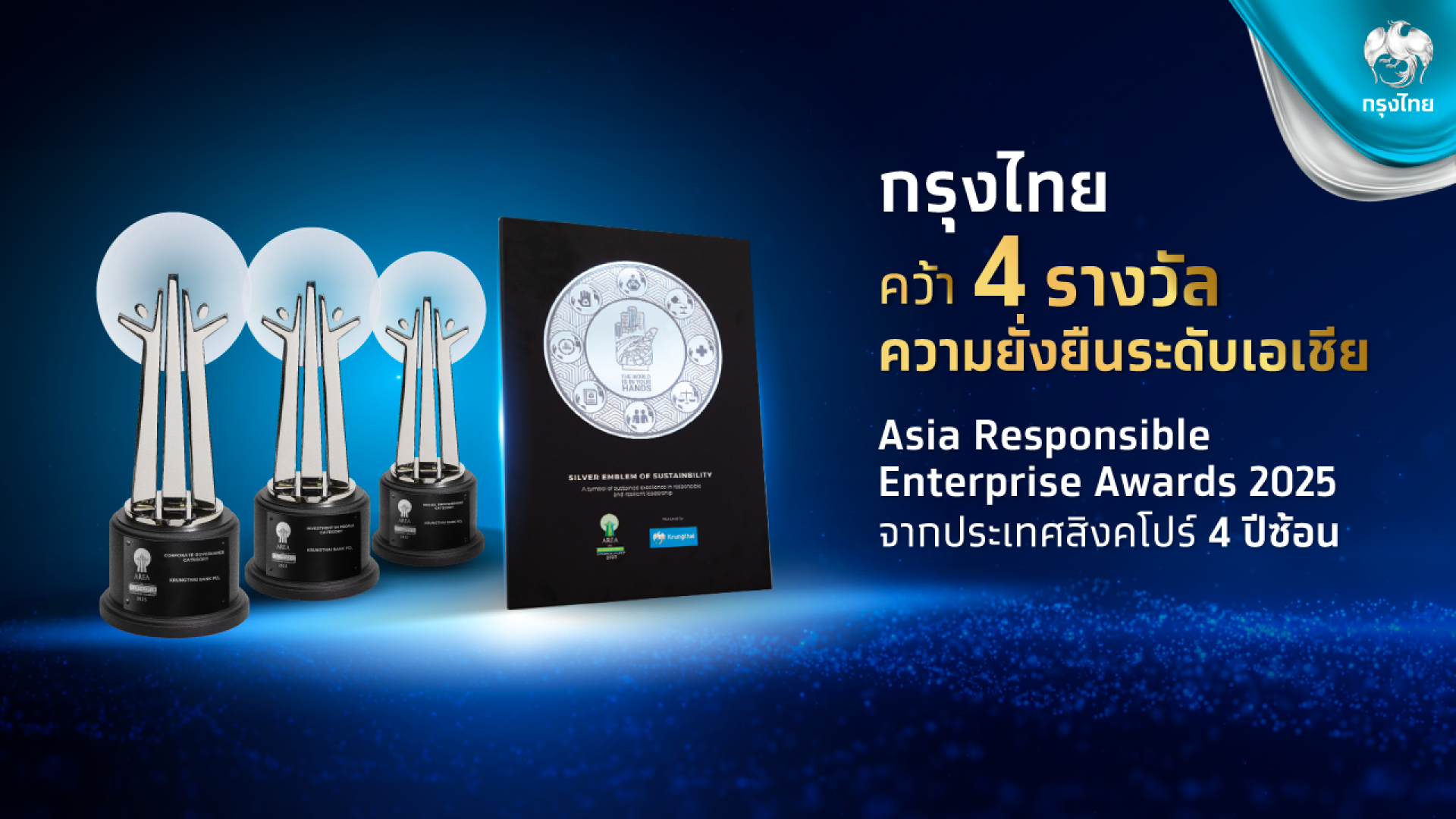 ธนาคารกรุงไทย คว้ารางวัลด้านความยั่งยืน จากเวที Asia Responsible Enterprise Awards (AREA) 2025 จัดโดย Enterprise Asia ประเทศสิงคโปร์ เพื่อเชิดชูเกียรติองค์กรธุรกิจในเอเชีย ที่มีผลงานโดดเด่นด้านความรับผิดชอบต่อสังคมและสิ่งแวดล้อม ทั้งรางวัลในด้านสังคม บุคลากร และธรรมาภิบาล พร้อมรับ รางวัลเกียรติคุณ Emblem of Sustainability ตอกย้ำความมุ่งมั่นในการดำเนินธุรกิจตามแนวทาง ESG ก้าวสู่ธนาคารยั่งยืน