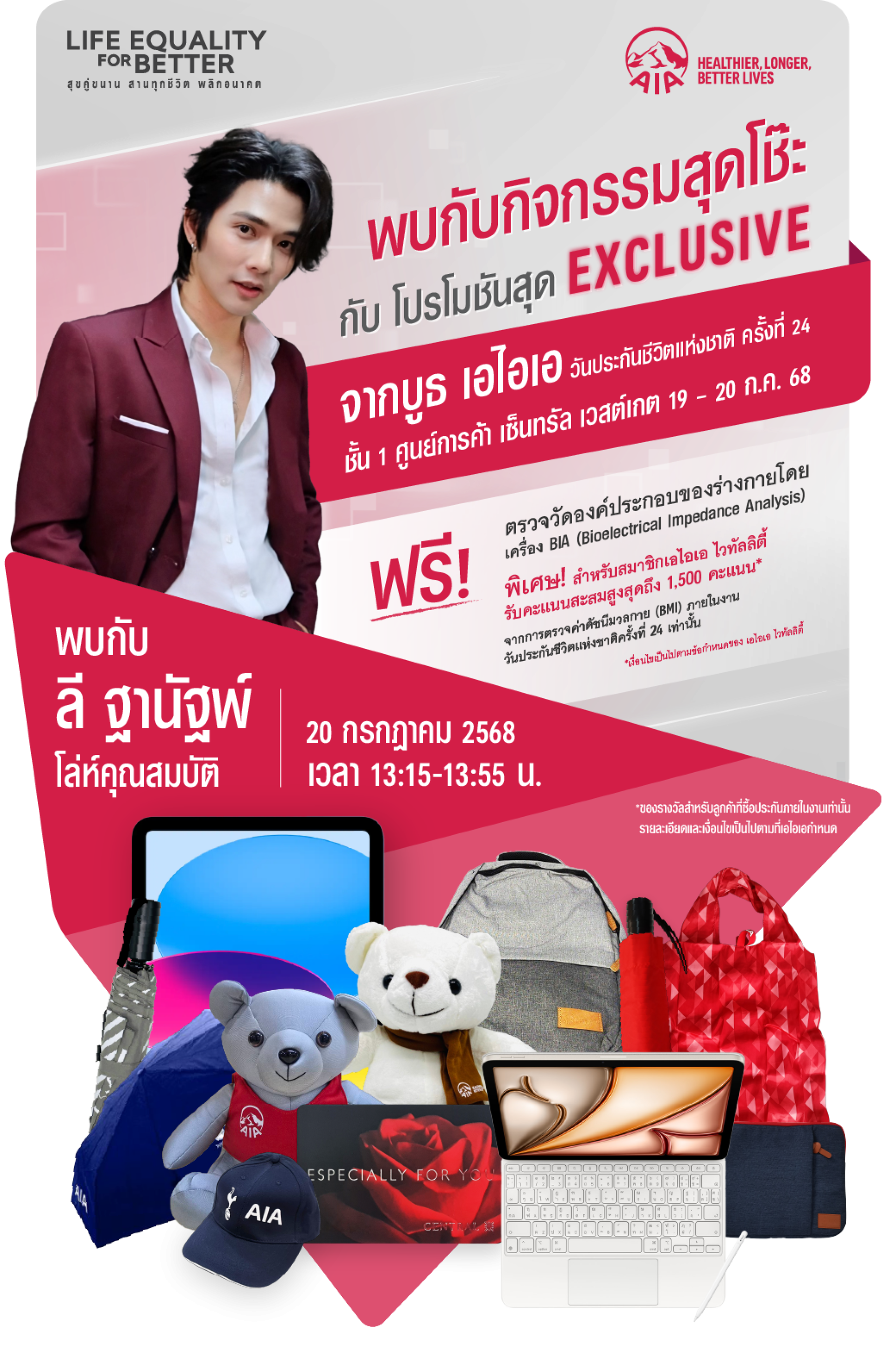 นอกจากนี้ เอไอเอยังได้เตรียมโปรโมชันสุดพิเศษมาให้สำหรับลูกค้าที่ซื้อผลิตภัณฑ์ภายในงาน และพบกับ ลี ฐานัฐพ์ โล่ห์คุณสมบัติ ซึ่งจะมามอบความบันเทิงและสร้างรอยยิ้มให้กับแฟน ๆ ในวันอาทิตย์ที่ 20 กรกฎาคม เวลา 13.15 13.55 น. ยิ่งไปกว่านั้น ยังมีบูธกิจกรรม AIA ONE BILLION DAY 2025 ที่เปิดต้อนรับผู้ที่สนใจร่วมวิ่งเทรลและ Fun Run พร้อมสนุกกับคอนเสิร์ตจากศิลปินสุดฮิตในตำนาน โดยผู้ที่สนใจสามารถสมัครเข้าร่วมกิจกรรม AIA ONE BILLION DAY 2025 ได้ภายในงาน พร้อมรับของที่ระลึก Limited Edition