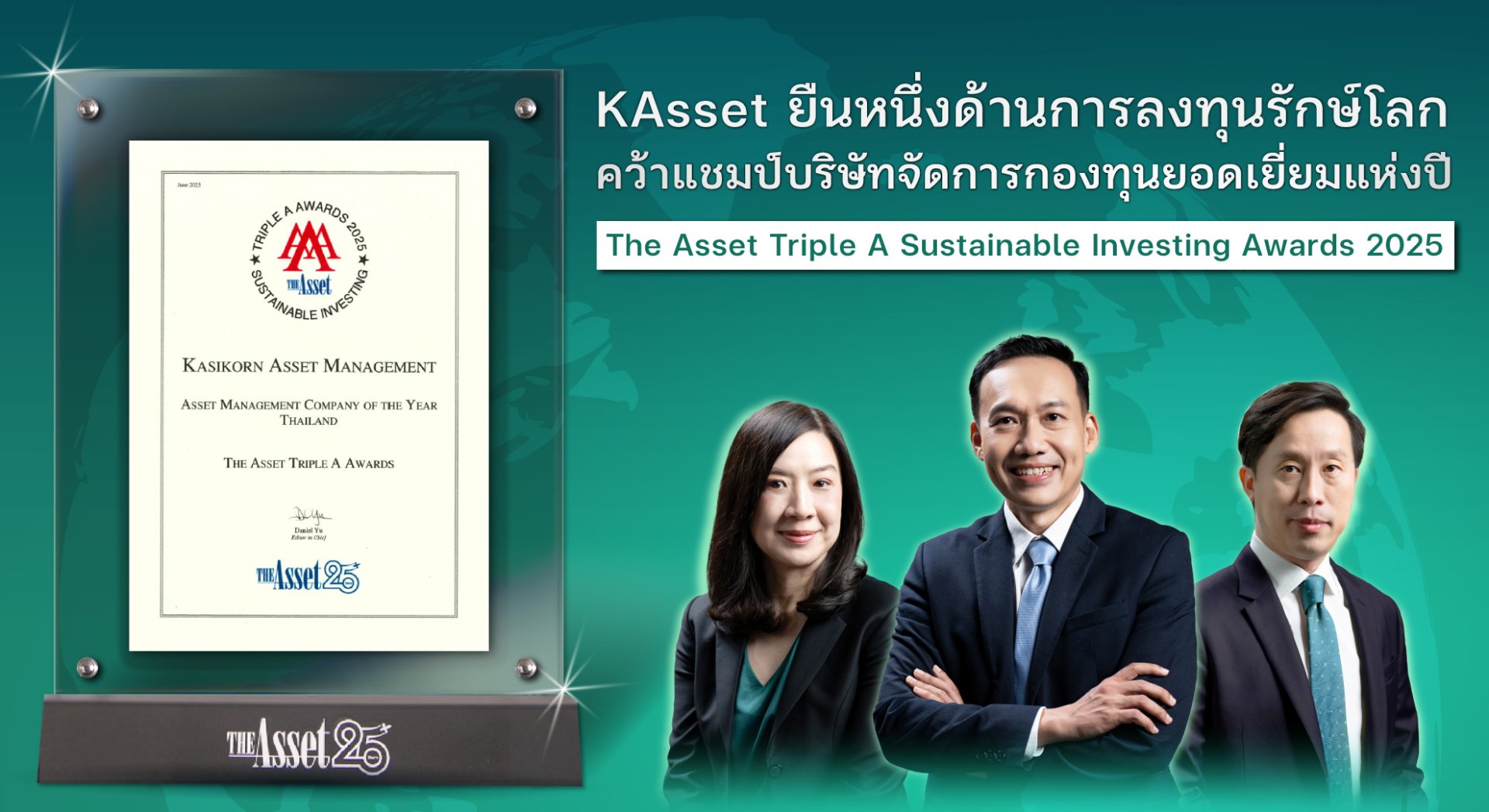 บริษัทหลักทรัพย์จัดการกองทุน กสิกรไทย จำกัด (บลจ.กสิกรไทย) ได้รับรางวัล Asset Management Company of the Year Sustainable Investing จากเวที The Asset Triple A Awards 2025 ซึ่งสะท้อนถึงความมุ่งมั่นอย่างต่อเนื่องของ บลจ.กสิกรไทย ในการดำเนินธุรกิจภายใต้แนวทางการลงทุนอย่างยั่งยืน โดยเน้นผลลัพธ์ที่เป็นรูปธรรมในทุกมิติของ ESG เพื่อยกระดับมาตรฐานการลงทุนของไทยให้ทัดเทียมกับระดับสากล โดยนายวิน พรหมแพทย์ CFA, ประธานกรรมการบริหาร พร้อมด้วยนายวจนะ วงศ์ศุภสวัสดิ์ CFA, กรรมการผู้จัดการ และนางสาวธิดาศิริ ศรีสมิต CFA, Chief Investment Officer บลจ.กสิกรไทย เป็นตัวแทนร่วมแสดงความยินดีกับความสำเร็จในครั้งนี้