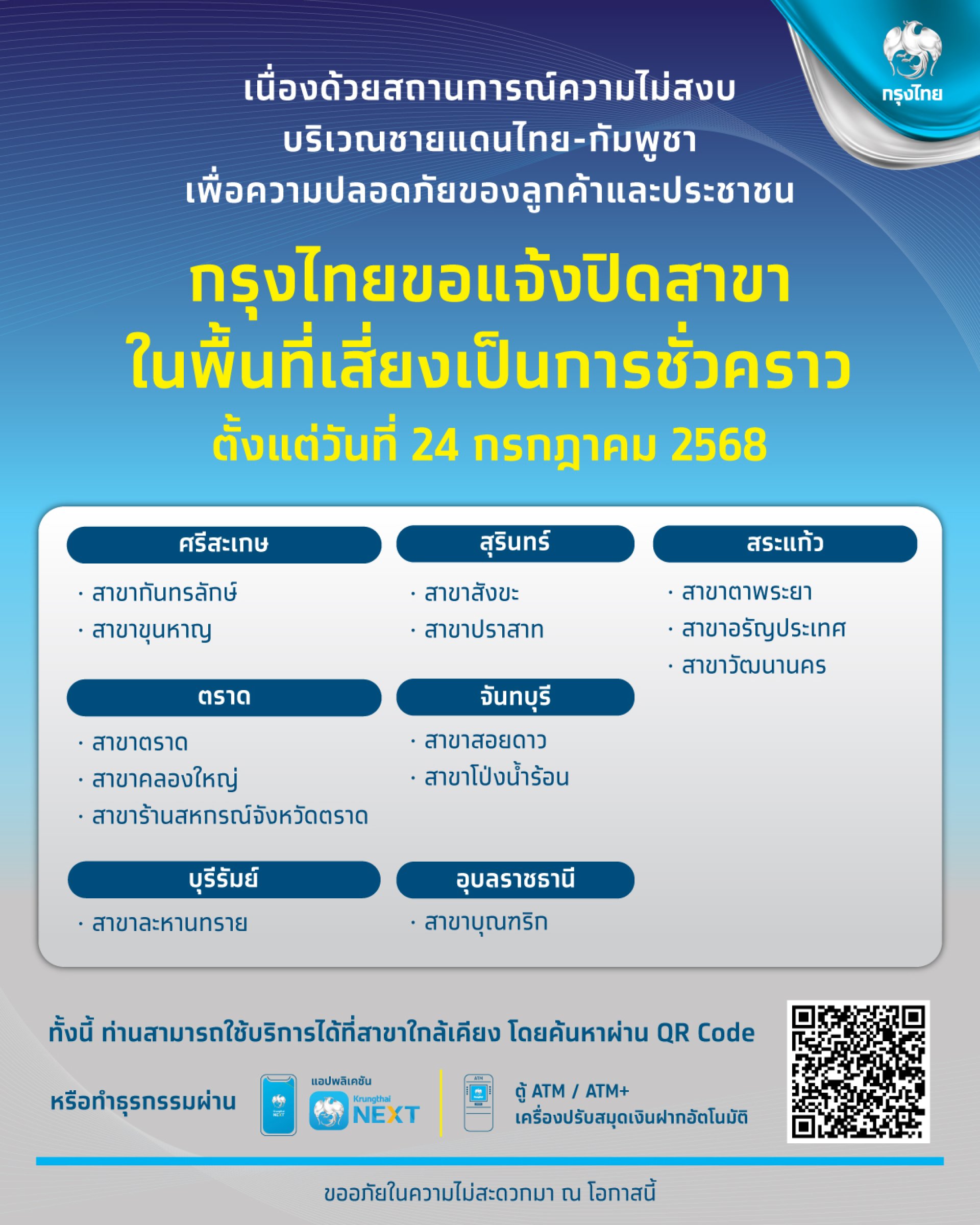 ธนาคารกรุงไทยขอแจ้งปิดบริการสาขาในพื้นที่เสี่ยงเป็นการชั่วคราว ตั้งแต่วันที่ 24 กรกฎาคม 2568 เป็นต้นไป เนื่องจากสถานการณ์ความไม่สงบ บริเวณชายแดนไทย-กัมพูชา เพื่อความปลอดภัยของลูกค้า และ ประชาชน