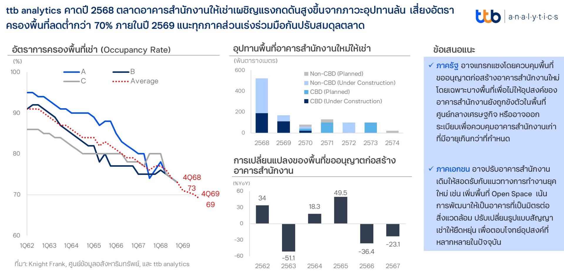 ttb analytics คาดปี 2568 ตลาดอาคารสำนักงานให้เช่าเผชิญแรงกดดันสูงขึ้นจากภาวะอุปทานล้น เสี่ยงอัตราครองพื้นที่ลดต่ำกว่า 70% ภายในปี 2569 แนะทุกภาคส่วนเร่งร่วมมือกันปรับสมดุลตลาด