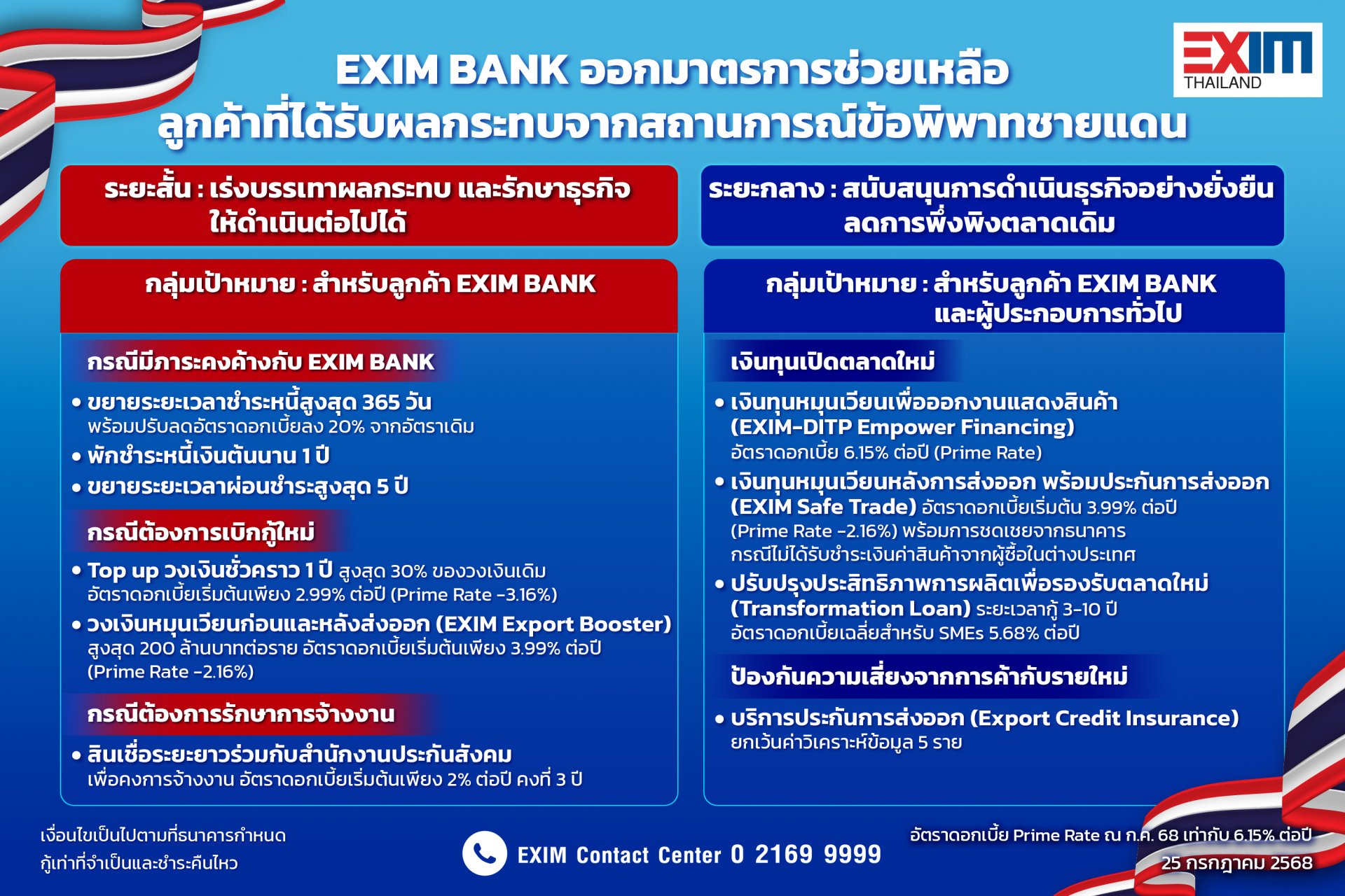 EXIM BANK ขอส่งความห่วงใย เป็นกำลังใจให้ทหารไทย และพี่น้องประชาชนที่ได้รับผลกระทบจากสถานการณ์ชายแดน ขอให้ทุกท่านปลอดภัยและผ่านพ้นสถานการณ์นี้ไปด้วยกัน ลูกค้าและผู้ประกอบธุรกิจเกี่ยวเนื่องกับการค้าระหว่างประเทศ สามารถรับปรึกษา หรือสอบถามข้อมูลได้ที่ EXIM Contact Center โทร. 0 2169 9999 หรือ Inbox Facebook EXIM Bank of Thailand