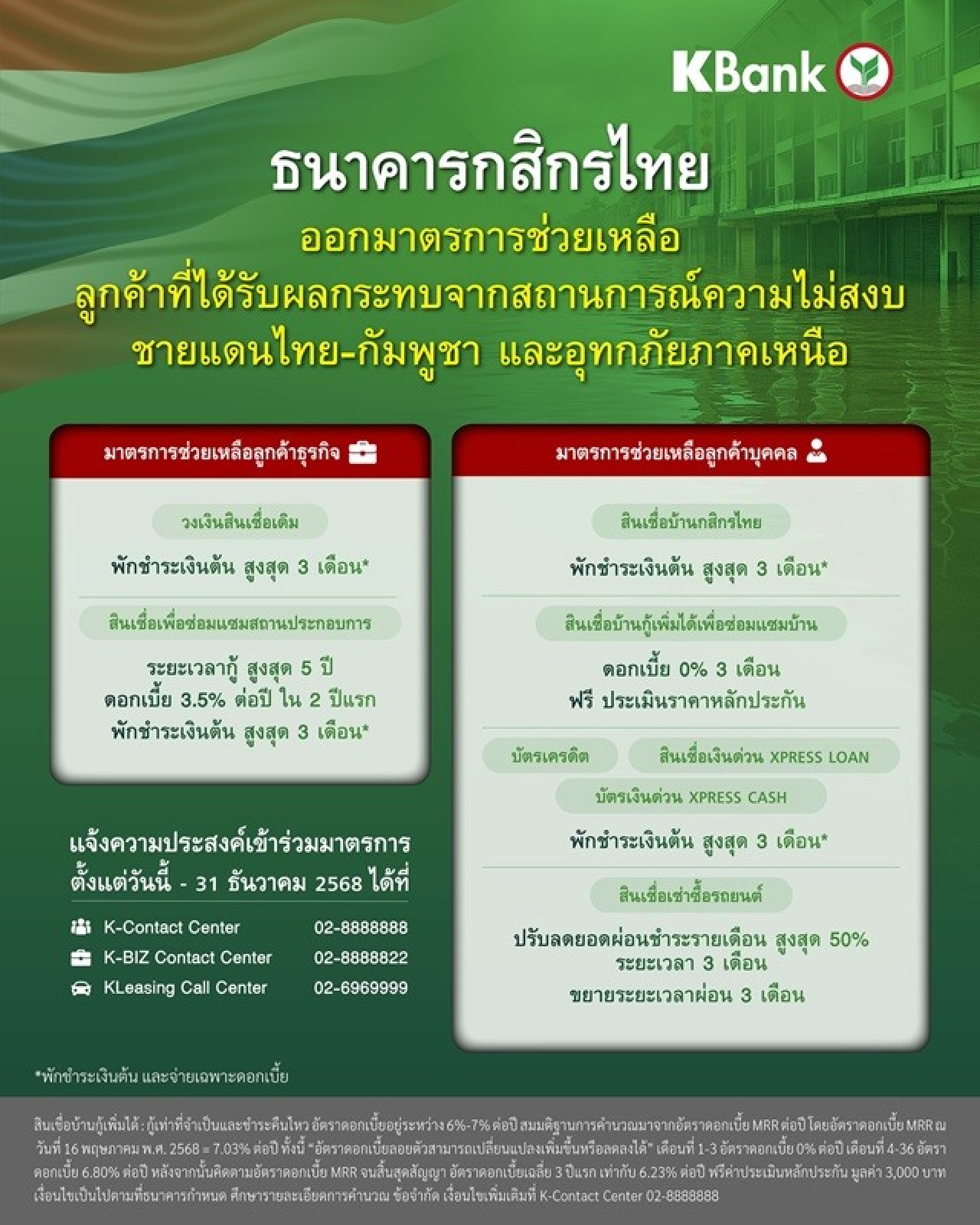 นายรุ่งเรือง สุขเกิดกิจพิบูลย์ ผู้จัดการใหญ่ ธนาคารกสิกรไทย เปิดเผยว่า จากสถานการณ์ความไม่สงบที่ชายแดนไทย-กัมพูชา และสถานการณ์อุทกภัยในภาคเหนือที่เกิดขึ้นจากอิทธิพลของพายุ วิภา ได้ส่งผลกระทบต่อทรัพย์สินและความเป็นอยู่ของประชาชนในหลายพื้นที่ ธนาคารกสิกรไทยตระหนักดีถึงความเดือดร้อนของลูกค้าที่ได้รับผลกระทบโดยตรง จึงรีบดำเนินการเร่งด่วนออกมาตรการช่วยเหลือลูกค้าทั้งลูกค้าบุคคลและลูกค้าธุรกิจ เพื่อช่วยแบ่งเบาภาระและช่วยให้ลูกค้าสามารถพลิกฟื้นกลับสู่สถานการณ์ปกติได้ในเร็ววัน โดยมีรายละเอียดมาตรการช่วยเหลือดังนี้