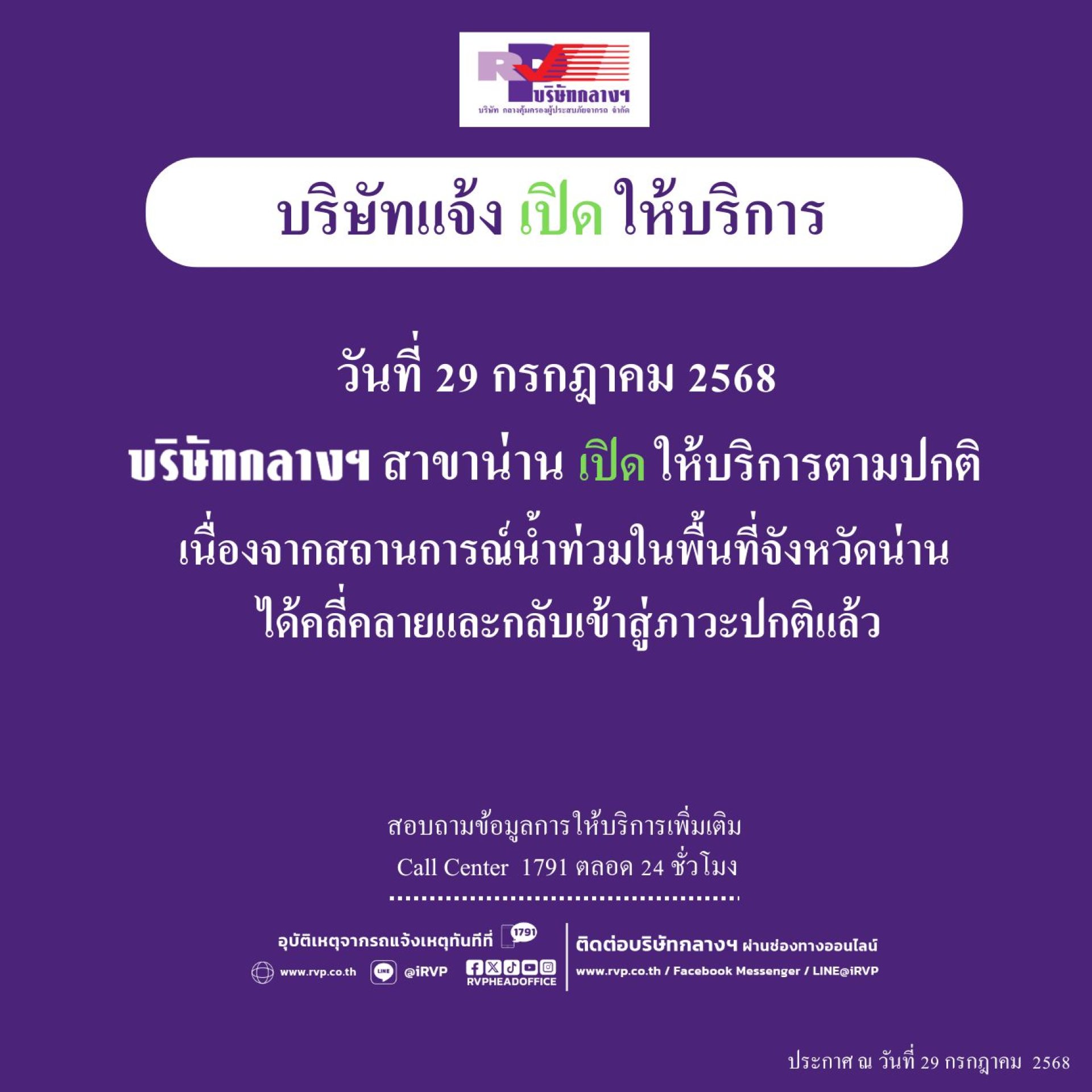 ซึ่งส่งผลกระทบต่อการเดินทางมาปฏิบัติงานของพนักงาน ขณะนี้สถานการณ์ดังกล่าวได้กลับสู่ภาวะปกติ โดยบริษัทสามารถให้บริการประชาชนรวมทั้งหน่วยงานต่างๆ ที่เกี่ยวข้องได้อย่างปกติ ในวันที่ 29 กรกฎาคม 2568 เป็นต้นไป