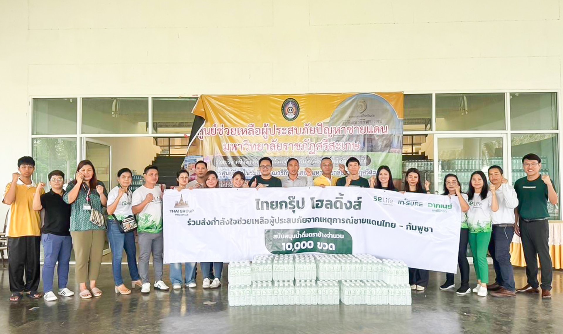 บริษัท ไทยกรุ๊ป โฮลดิ้งส์ จำกัด (มหาชน) กลุ่มธุรกิจประกันและการเงินในเครือทีซีซี ขอร่วมเป็นอีกหนึ่งกำลังใจ พร้อมสนับสนุนน้ำดื่มตราช้างจำนวน 10,000 ขวด เพื่อนำไปช่วยเหลือผู้ได้รับผลกระทบจากสถานการณ์ความไม่สงบในพื้นที่ชายแดนไทย-กัมพูชา โดยมีผู้บริหารตัวแทนและพนักงาน SE Life อาคเนย์ประกันชีวิต และ IN-SURE อินทรประกันภัย ร่วมเป็นตัวแทนส่งมอบให้แก่ ผศ.ดร.เชี่ยวชาญ แสงทอง รองอธิการบดี และดร.เจษฎา ชาตรี รองอธิการบดี มหาวิทยาลัยราชภัฏศรีสะเกษ ณ ศูนย์ช่วยเหลือผู้ประสบภัยปัญหาชายแดน มหาวิทยาลัยราชภัฏศรีสะเกษ จังหวัดศรีสะเกษ เมื่อเร็ว ๆ นี้