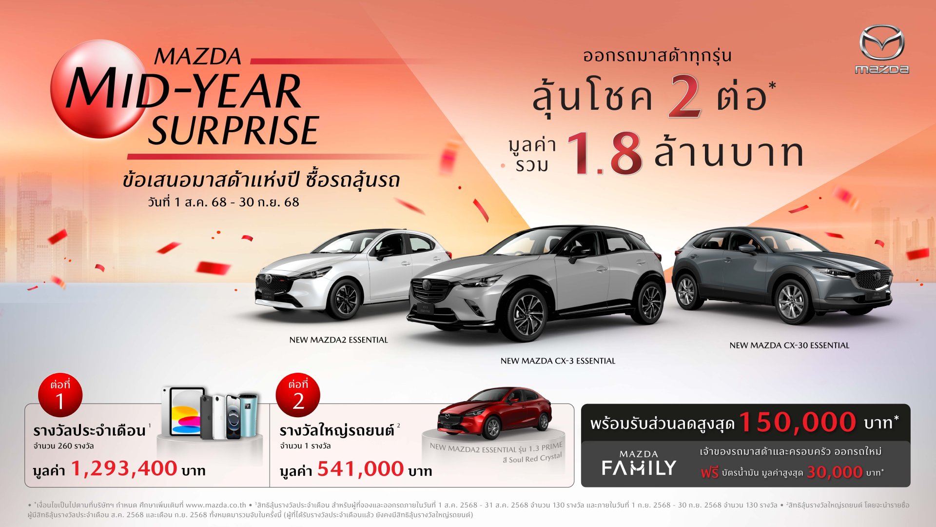 สำหรับแคมเปญ MAZDA MID-YEAR SURPRISE ข้อเสนอมาสด้าแห่งปี ซื้อรถลุ้นรถ จัดขึ้นตั้งแต่วันที่ 1 สิงหาคม 2568 30 กันยายน 2568 เพื่อให้ลูกค้าที่ซื้อรถยนต์มาสด้าคันใหม่ในเดือนสิงหาคมและกันยายน ได้มีโอกาสลุ้นรับโชคถึง 2 ต่อ ทั้งรางวัลประจำเดือนที่จัดเตรียมไว้ถึง 260 รางวัล และรางวัลใหญ่กับรถยนต์มาสด้า2 อีกหนึ่งรางวัล ดังรายละเอียดต่อไปนี้