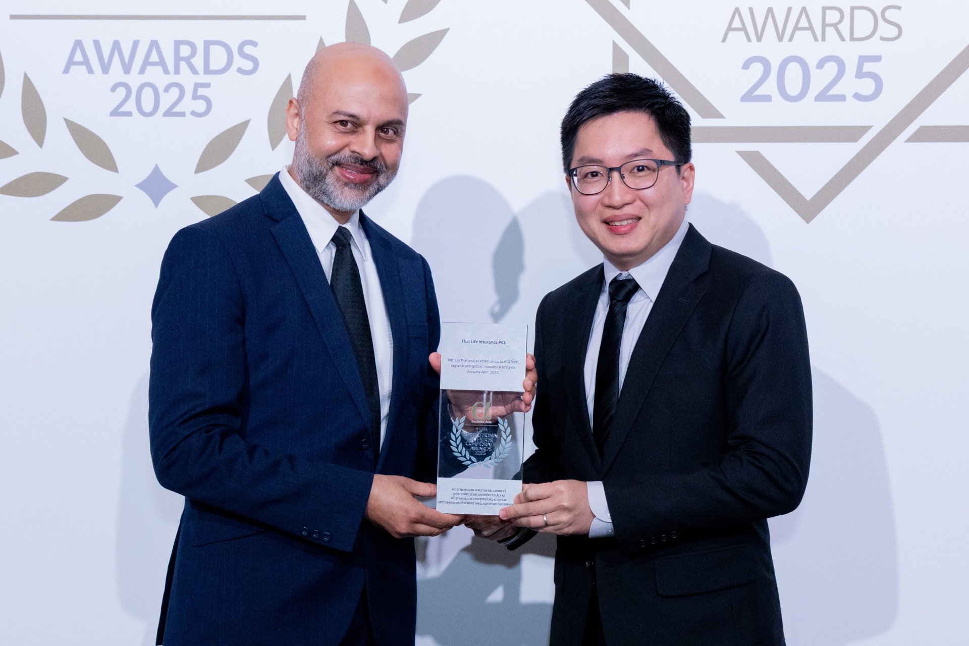 นายฉี - หลิง หยาง Chief Actuary บริษัท ไทยประกันชีวิต จำกัด (มหาชน) ร่วมรับ 3 รางวัลอันทรงเกียรติจากเวทีระดับภูมิภาค Alpha Southeast Asia Awards 2025 สาขา Institutional Investor Corporate Awards ประกอบด้วย รางวัลการยึดมั่นในบรรษัทภิบาลสูงสุด (Strongest Adherence to Corporate Governance Award) รางวัลการจัดการด้านนักลงทุนสัมพันธ์ที่ดีที่สุด (Most Organized Investor Relations Award) และรางวัลผู้บริหารที่มีส่วนสนับสนุนกิจกรรมนักลงทุนสัมพันธ์ (Best Senior Management Investor Relations Support Award) สะท้อนการดำเนินธุรกิจของไทยประกันชีวิตที่ยึดมั่นในบรรษัทภิบาลและความโปร่งใส รวมถึงความเป็นเลิศในการบริหารจัดการงานด้านนักลงทุนสัมพันธ์ ซึ่งช่วยยกระดับความน่าเชื่อถือ และเสริมสร้างความมั่นใจให้แก่ผู้ถือหุ้นและนักลงทุนในระดับสากล