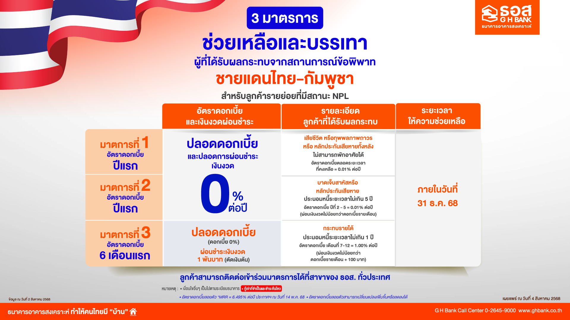 ทั้งนี้ผู้ที่ต้องการเข้าร่วมมาตรการช่วยเหลือและบรรเทาผู้ที่ได้รับผลกระทบจากสถานการณ์พิพาทชายแดนไทย กัมพูชา สามารถติดต่อขอเข้าร่วมมาตรการได้ที่สาขาธนาคารได้ตั้งแต่วันนี้ถึงวันที่ 31 ธันวาคม 2568 พร้อมแสดงหลักฐานที่ได้รับผลกระทบจากการประกอบอาชีพ / ธุรกิจ / การค้าจากสถานการณ์ข้อพิพาทชายแดน อาทิ หลักฐานรายได้ หรือหนังสือรับรองจากหน่วยงานต้นสังกัด ภาพถ่ายกิจการ หรืออื่น ๆ ที่แสดงให้เห็นว่าได้รับผลกระทบดังกล่าวอย่างชัดเจน และเอกสารต่าง ๆ เพื่อนำมาประกอบการพิจารณา สอบถามรายละเอียดเพิ่มเติมได้ที่ ธอส.ทุกสาขาทั่วประเทศ หรือ G H Bank Call Center โทร.0-2645-9000 หรือ Facebook Fanpage ธนาคารอาคารสงเคราะห์ และติดตามข่าวสารของธนาคารได้ที่ Application : GHB ALL GEN และ www.ghbank.co.th