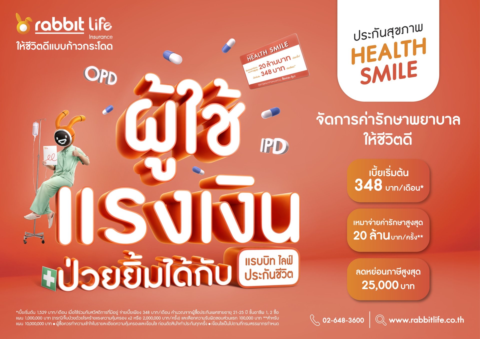 แผนประกันสุขภาพเหมาจ่าย Health Smile จึงถูกออกแบบให้สามารถ ใช้ร่วมกับสวัสดิการค่ารักษาพยาบาลของบริษัทหรือประกันสุขภาพอื่นๆที่มีอยู่ได้จริง เพิ่มความครอบคลุมจากสิทธิเดิมที่ได้รับจากสวัสดิการหรือที่มี พร้อมเปิดทางเลือกความคุ้มครองแบบเหมาจ่ายที่มีให้เลือกหลายแผน ปรับได้ตามไลฟ์สไตล์และพฤติกรรมของแต่ละบุคคล สะท้อนแนวคิดของ Rabbit Life ที่มองว่าประกันสุขภาพไม่ใช่เพียงเรื่องของการคุ้มครองโรคภัย แต่คือเครื่องมือในการสนับสนุนคุณภาพชีวิตและความมั่นคงทางการเงินในระยะยาวอย่างแท้จริง คุ้มค่าด้วยเบี้ยประกันเริ่มต้นเพียง 348 บาทต่อเดือน* แต่ให้ความคุ้มครองค่ารักษาแบบเหมาจ่ายสูงสุดถึง 20 ล้านบาทต่อครั้ง และยังใช้ร่วมกับสวัสดิการของบริษัทได้ เพื่อเพิ่มความครอบคลุมของค่าใช้จ่ายให้ครอบคลุมยิ่งขึ้น อีกทั้งยังสามารถใช้สิทธิ์ลดหย่อนภาษีจากเบี้ยประกันได้สูงสุดถึง 25,000 บาทต่อปี