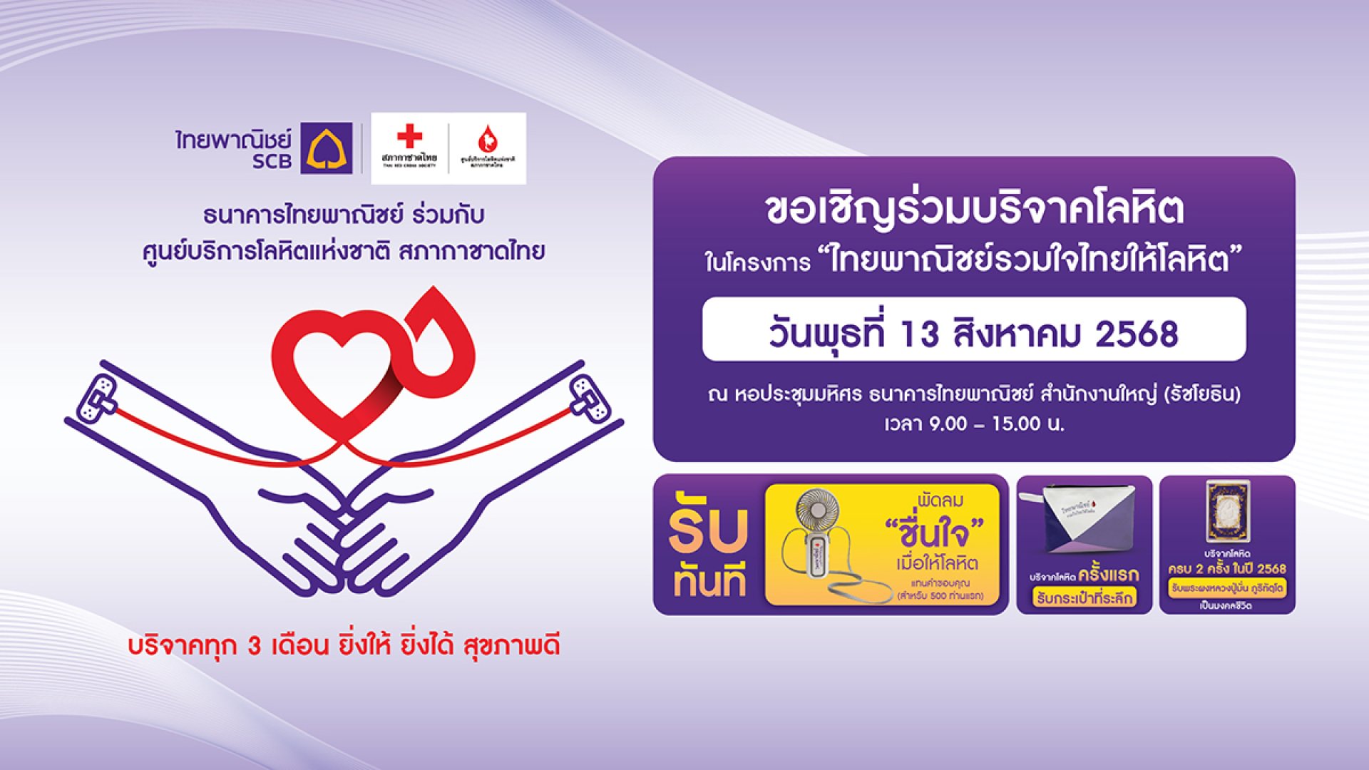 กลุ่มเอสซีบีเอกซ์ โดยธนาคารไทยพาณิชย์ ร่วมกับ ศูนย์บริการโลหิตแห่งชาติ สภากาชาดไทย ขอเชิญร่วมบริจาคโลหิต เติมเต็มปริมาณโลหิตสำรองคงคลัง ภายใต้โครงการ ไทยพาณิชย์รวมใจไทยให้โลหิต ในวันพุธที่ 13 สิงหาคม 2568 เวลา 9.00-15.00 น. ณ หอประชุมมหิศร ธนาคารไทยพาณิชย์ สำนักงานใหญ่ (รัชโยธิน) เพื่อส่งต่อโลหิตที่มีคุณภาพให้มีเพียงพอต่อการรักษาพยาบาลผู้ป่วยทั่วประเทศ ยังมีผู้ป่วยจำนวนมากที่กำลังรอรับโลหิตเพื่อต่อลมหายใจ ทุก ๆ การบริจาคโลหิต 1 ครั้ง สามารถนำไปช่วยชีวิตผู้ป่วยได้มากกว่า 3 ชีวิต สำหรับผู้ที่บริจาคโลหิตครั้งแรกรับทันทีกระเป๋าที่ระลึก บริจาคโลหิตครบ 2 ครั้งในปี 2568 รับพระผงหลวงปู่มั่น ภูริทตฺโต เป็นมงคลชีวิต และ 500 ท่านแรกที่ร่วมบริจาคโลหิต รับพัดลม ชื่นใจ แทนคำขอบคุณ