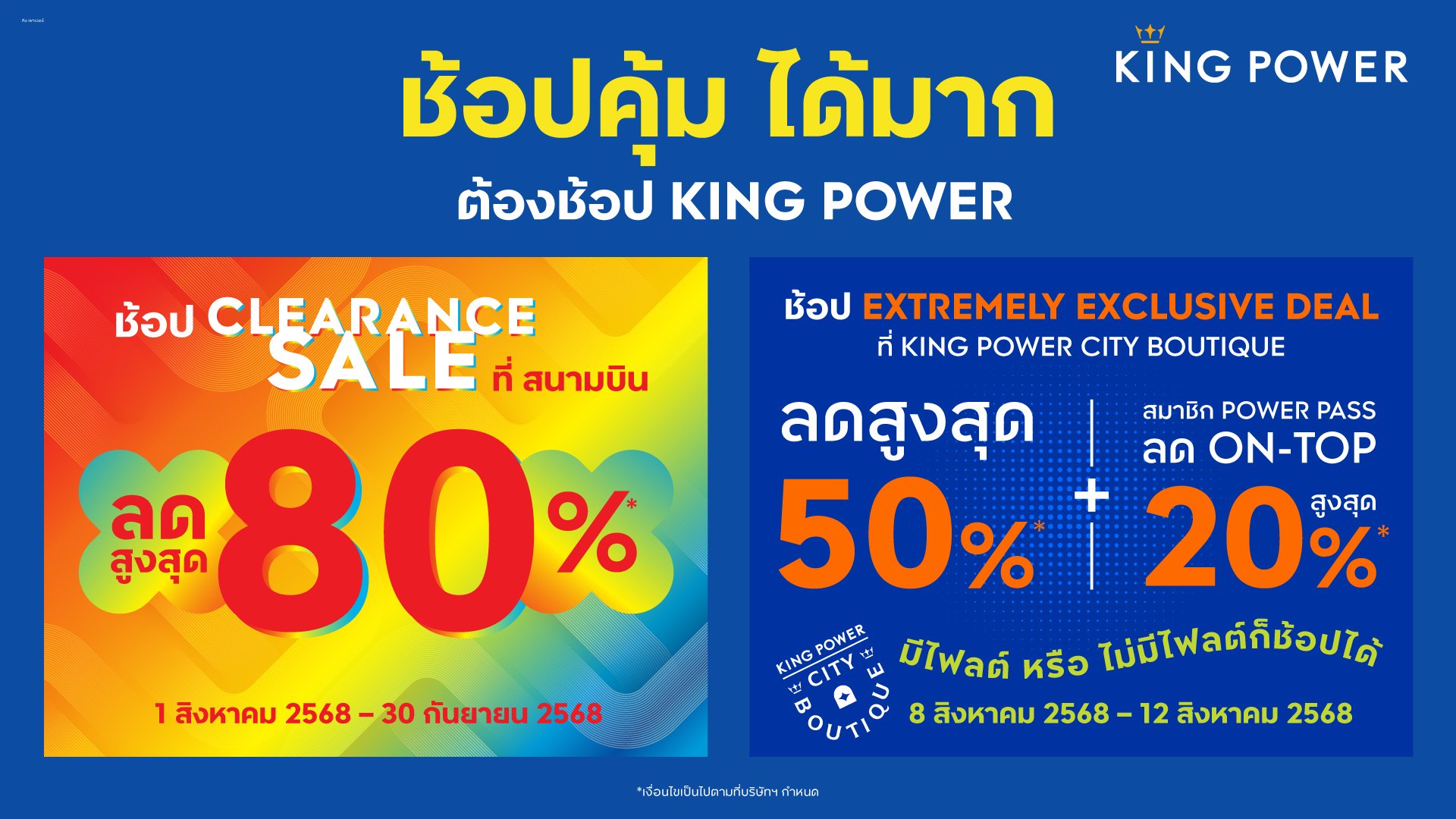 · คิง เพาเวอร์ ท่าอากาศยานสุวรรณภูมิ และดอนเมือง จัดแคมเปญ KING POWER CLEARANCE SALE UP TO 80% พบสินค้าแฟชั่นจากแบรนด์ชั้นนำลดสูงสุด 80% พิเศษ! สินค้าน้ำหอม เครื่องสำอาง นาฬิกา จิวเวลรี รับส่วนลดสูงสุด 50% (สินค้ามีจำนวนจำกัด) ตั้งแต่วันนี้ 30 กันยายน 2568