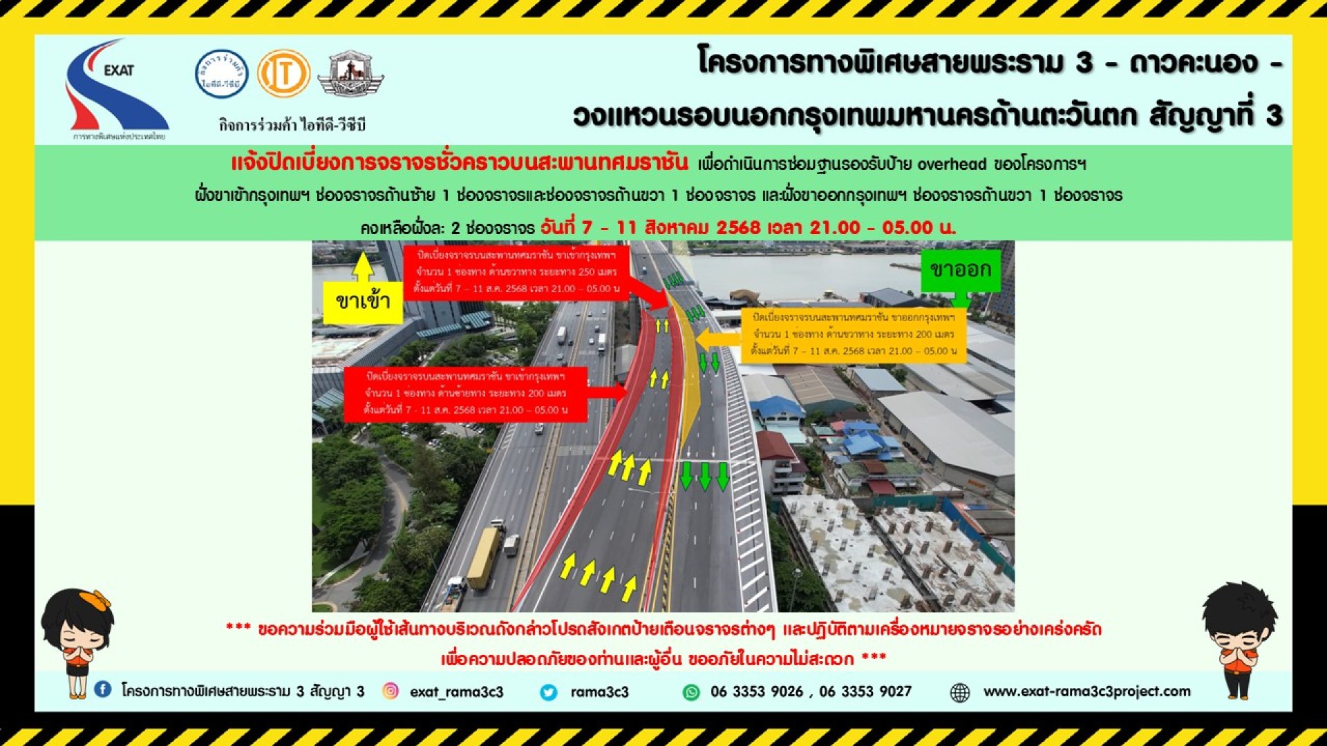 การทางพิเศษแห่งประเทศไทย (กทพ.) กระทรวงคมนาคมได้ว่าจ้าง กิจการร่วมค้า ไอทีดี-วีซีบี (ITD-VCB Joint Venture) ประกอบด้วย บริษัท อิตาเลียนไทย ดีเวล๊อปเมนต์ จำกัด (มหาชน) และ บริษัท วิจิตรภัณฑ์ก่อสร้าง จำกัด เป็นผู้รับจ้างดําเนินการก่อสร้าง โครงการทางพิเศษสายพระราม3 - ดาวคะนอง - วงแหวนรอบนอกกรุงเทพมหานครด้านตะวันตกสัญญาที่ 3 แจ้งปิดเบี่ยงการจราจรชั่วคราว บริเวณสะพานทศมราชัน เพื่อดำเนินการซ่อมฐานรองรับป้าย Overhead ของโครงการฯ ตั้งแต่วันที่ 7 - 11 ส.ค. 2568 ช่วงเวลา 21.00 - 05.00 น. ดังนี้