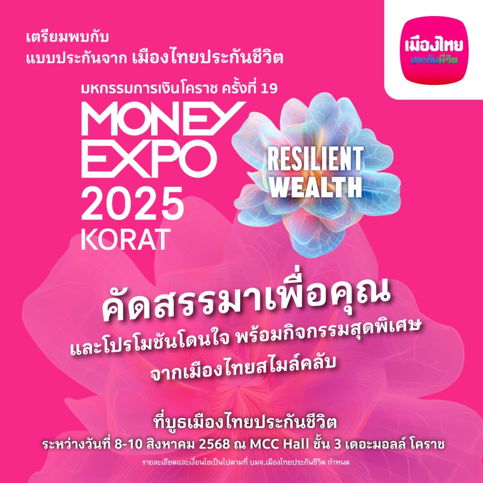 แล้วพบกันที่ บูธเมืองไทยประกันชีวิต ในงานมหกรรมการเงินโคราช ครั้งที่ 19 Money Expo 2025 Korat ระหว่างวันที่ 8-10 สิงหาคม 2568 ณ MCC Hall ชั้น 3 เดอะมอลล์ โคราช #เมืองไทยประกันชีวิต #MuangThaiLife