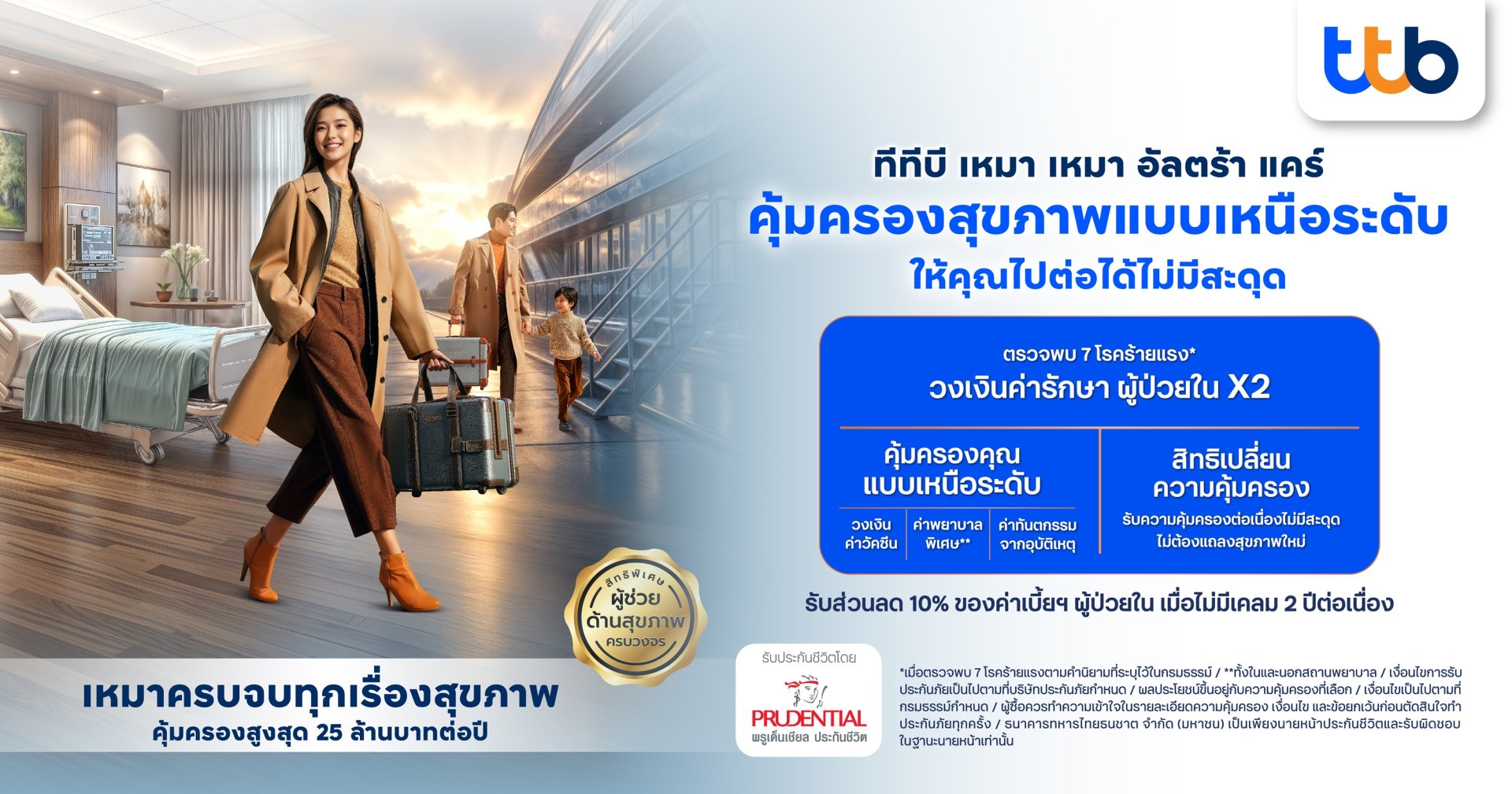 ทีเอ็มบีธนชาต หรือ ทีทีบี ร่วมกับ พรูเด็นเชียล ประเทศไทย เดินหน้าสร้างความมั่นใจด้านสุขภาพให้กับลูกค้า เปิดตัวแผนประกันชีวิตและสุขภาพใหม่ล่าสุด ทีทีบี เหมา เหมา อัลตร้า แคร์ ที่ให้ความคุ้มครองสุขภาพแบบเหนือระดับ เพื่อให้ลูกค้าสามารถเลือกรับการรักษาที่ดีที่สุดในเวลาที่เจ็บป่วย และให้ชีวิตทุกด้านได้ไปต่อได้อย่างมั่นใจ ไม่มีสะดุด ด้วยวงเงินความคุ้มครองค่ารักษาผู้ป่วยในแบบเหมาจ่ายสูงสุด 25 ล้านบาทต่อปี และหากเจ็บป่วยด้วย 7 โรคร้ายแรง* ผู้เอาประกันภัยจะได้รับผลประโยชน์ความคุ้มครองผู้ป่วยในเพิ่มขึ้นเป็น 2 เท่า สูงสุดถึง 50 ล้านบาทต่อปี เพื่อให้ลูกค้ามีแผนสุขภาพที่ครอบคลุม ช่วยให้แผนทางการเงินมั่นคงขึ้น ทั้งในวันนี้และอนาคต