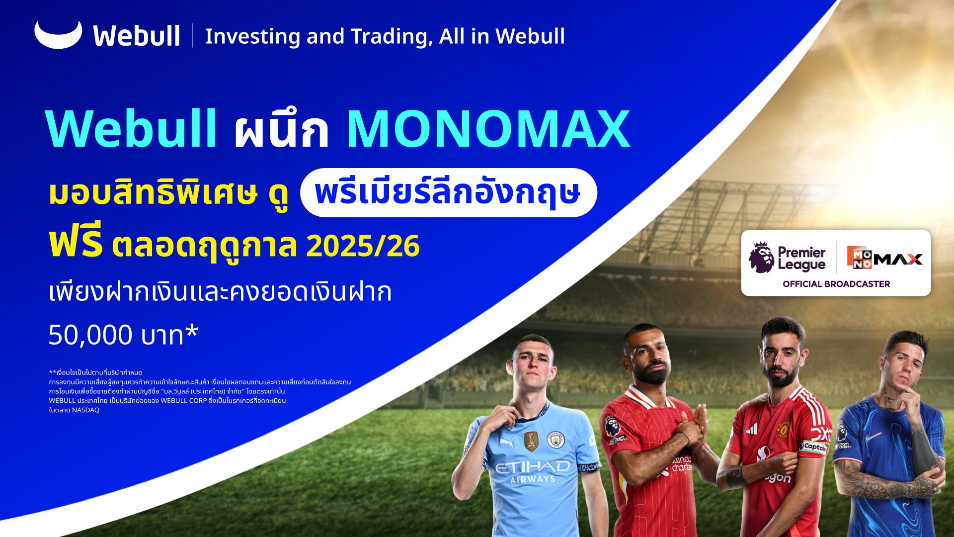 บริษัทหลักทรัพย์ วีบูลล์ (ประเทศไทย) จำกัด หรือ Webull Thailand บริษัทย่อยของ Webull Corporation (NASDAQ : BULL) เจ้าของแพลตฟอร์มเทรดออนไลน์ Webull ได้ประกาศแคมเปญพิเศษให้ผู้ลงทุนชาวไทย สามารถรับชม ฟุตบอลพรีเมียร์ลีกอังกฤษ (English Premier League) จากทางแพลตฟอร์ม Monomax ได้ฟรีตลอด 1 ฤดูกาล (ตั้งแต่ช่วงเดือนสิงหาคม 2025 - พฤษภาคม 2026) ซึ่งคิดเป็นมูลค่ากว่า 2,999 บาท เพียงแค่ผู้ลงทุนฝากเงินและสามารถรักษายอดเงินฝากในบัญชีซื้อขายหลักทรัพย์ของ Webull เป็นจำนวนสะสมสุทธิตั้งแต่ 50,000 บาทขึ้นไป โดยผู้ลงทุนสามารถเข้าร่วมแคมเปญตั้งแต่วันนี้ ถึงวันที่ 30 กันยายน 2025