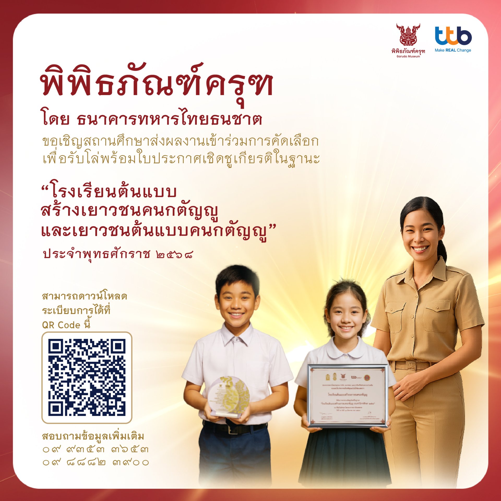 ทีทีบี เดินหน้าสร้างเยาวชนคุณภาพ ผ่านโครงการ โรงเรียนต้นแบบสร้างคนกตัญญู และ เยาวชนต้นแบบคนกตัญญู พร้อมเปิดโอกาสเยาวชนเรียนรู้คุณค่าทางวัฒนธรรมผ่าน พิพิธภัณฑ์ครุฑ สมัครได้ตั้งแต่วันนี้ ถึง 13 ต.ค. นี้