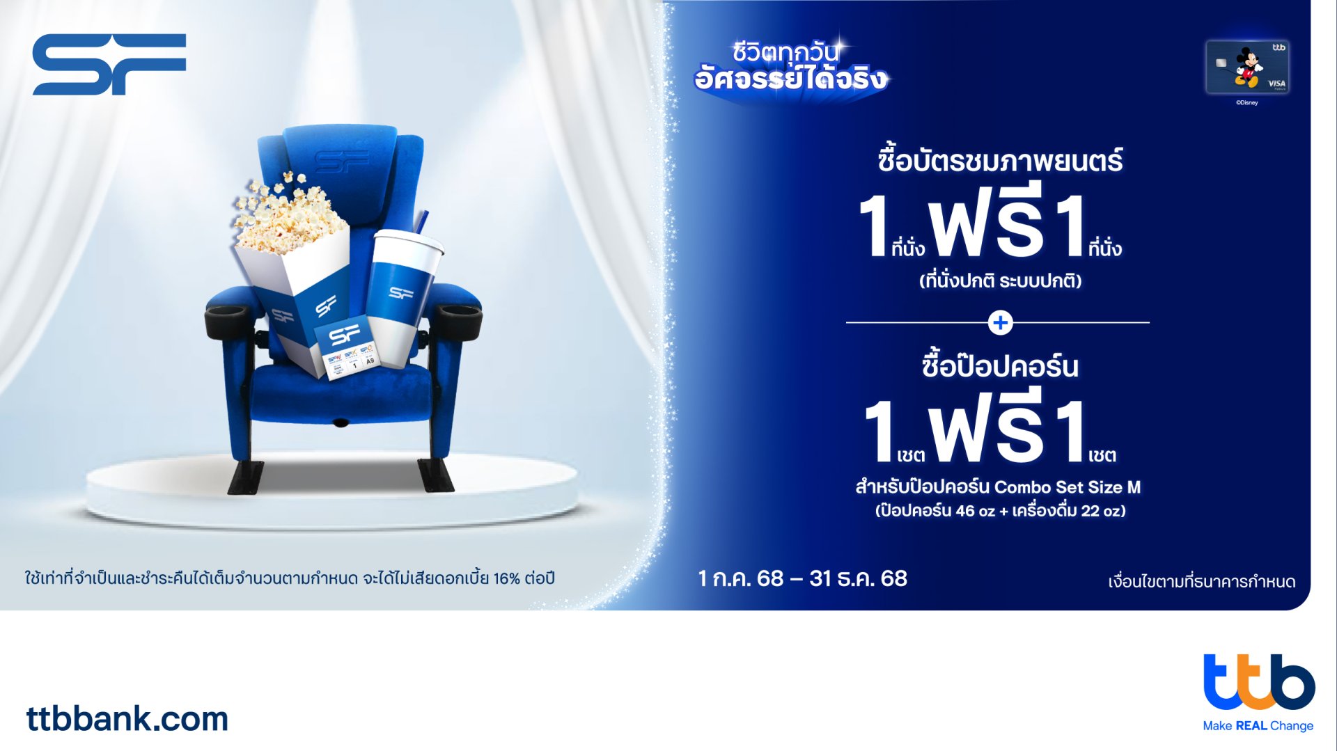 ทีเอ็มบีธนชาต หรือ ทีทีบี ร่วมกับ SF Cinema เชิญชวนคนรักการชมภาพยนตร์มาร่วมสัมผัสประสบการณ์ความคุ้มแบบคูณสอง โดยมอบสิทธิพิเศษเฉพาะผู้ถือบัตรเครดิต ttb Disney คุ้มที่ 1 เพียงซื้อบัตรชมภาพยนตร์จำนวน 1 ที่นั่ง รับฟรี 1 ที่นั่ง (ที่นั่งปกติ ระบบปกติ) ผ่านช่องทางเครื่องจำหน่ายตั๋วอัตโนมัติ Express Ticket, SF Application และ SF Website โดยลูกค้าต้องกดรับสิทธิ์ด้วยตนเองผ่านแอป ttb touch ก่อนชำระเงินผ่านบัตรเครดิต ttb Disney และคุ้มที่ 2 พิเศษมากกว่ารับสิทธิ์อิ่มอร่อยสุดฟิน เมื่อซื้อป๊อปคอร์น Combo Set Size M (ป๊อปคอร์น 46 oz และเครื่องดื่ม 22 oz) จำนวน 1 เซต รับฟรีทันที 1 เซต ตั้งแต่วันที่ 1 กรกฎาคม 2568 31 ธันวาคม 2568 ณ โรงภาพยนตร์ในเครือ SF ทุกสาขาทั่วประเทศ ยกเว้น SF Emprivé Cineclub ศึกษารายละเอียดเพิ่มเติมของโปรโมชัน ได้ที่ https://www.ttbbank.com/th/promotion/credit-card/others/ttb-disney-sfcinema-jul25