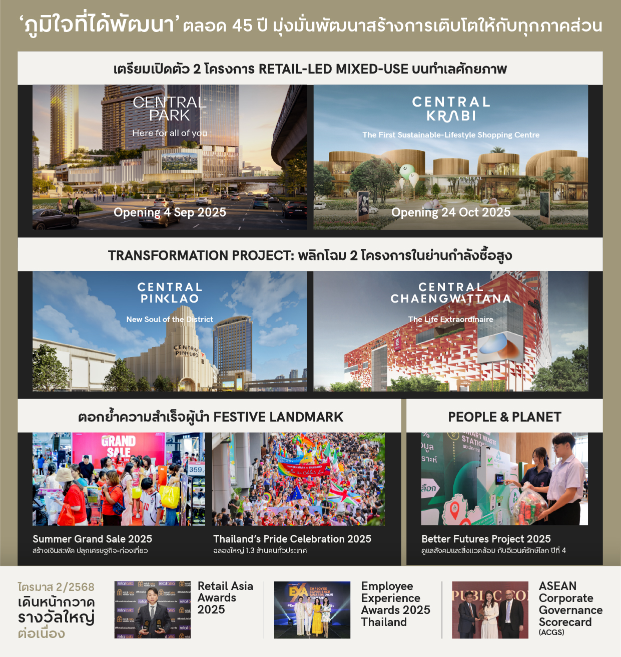 กรุงเทพฯ: บริษัท เซ็นทรัลพัฒนา จำกัด (มหาชน) เปิดผลประกอบการไตรมาส 2 ปี 2568 เติบโตแข็งแกร่งต่อเนื่องจากธุรกิจศูนย์การค้า บริษัทฯ มีรายได้รวม 11,653 ล้านบาท โต 3% และกำไรสุทธิ 3,902 ล้านบาท โต 10% จากปีก่อน (ไม่รวมธุรกิจอสังหาริมทรัพย์) โดยในไตรมาส 2 นี้ บริษัทฯ ได้ดำเนินการจ่ายเงินปันผล 2.10 บาทต่อหุ้น ซึ่งสูงสุดเป็นประวัติการณ์ สะท้อนฐานะทางการเงินที่แข็งแกร่งด้วยอัตราภาระหนี้สินต่อทุนที่ปรับตัวดีขึ้นเรื่อยๆ พร้อมสร้างผลตอบแทนเพิ่มขึ้นต่อเนื่องให้กับผู้ถือหุ้นในปี 2568 โดยประกาศซื้อหุ้นคืนวงเงินไม่เกิน 5 พันล้านบาทระหว่างวันที่ 18 สิงหาคม 2568 - 17 กุมภาพันธ์ 2569 เดินหน้าขับเคลื่อนแผนการเติบโตครั้งใหญ่ เปิดตัวเมกะโปรเจกต์ "เซ็นทรัล พาร์ค" ไตรมาส 3 และ "เซ็นทรัลกระบี่" ไตรมาส 4 เติมเต็มแลนด์มาร์กระดับโลกและกระจายศักยภาพสู่เมืองท่องเที่ยว ตอกย้ำบทบาทผู้นำการพัฒนาเมืองและเศรษฐกิจไทย ภายใต้แนวคิด "The Ecosystem for All" ที่เชื่อมโยงความแข็งแกร่งของทุกภาคส่วน ทั้งธุรกิจ ชุมชน สังคม และสิ่งแวดล้อม ให้เติบโตไปด้วยกันอย่างมั่นคงและยั่งยืน พร้อมคว้ารางวัลแห่งความสำเร็จในทุกมิติ สะท้อนถึงความมุ่งมั่นและความ ภูมิใจที่ได้พัฒนา ตลอด 45 ปีของเซ็นทรัลพัฒนา เพราะความสุขของคุณคือความภูมิใจของเรา