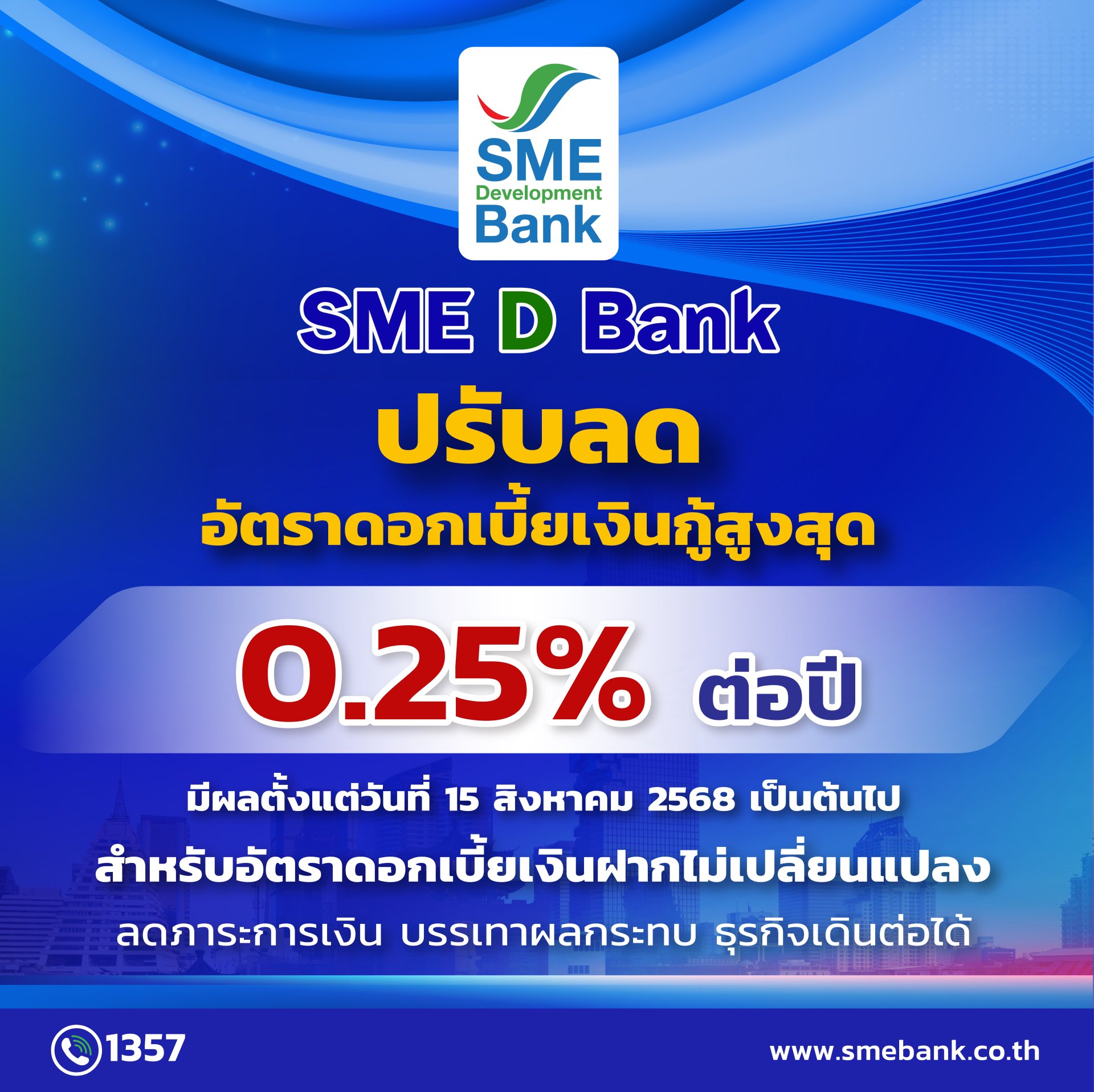 SME D Bank เคียงข้างเอสเอ็มอีไทย ประกาศลดอัตราดอกเบี้ยสูงสุด 0.25% ต่อปี เสริมแกร่งผู้ประกอบการยืนหยัดได้ในทุกสถานการณ์