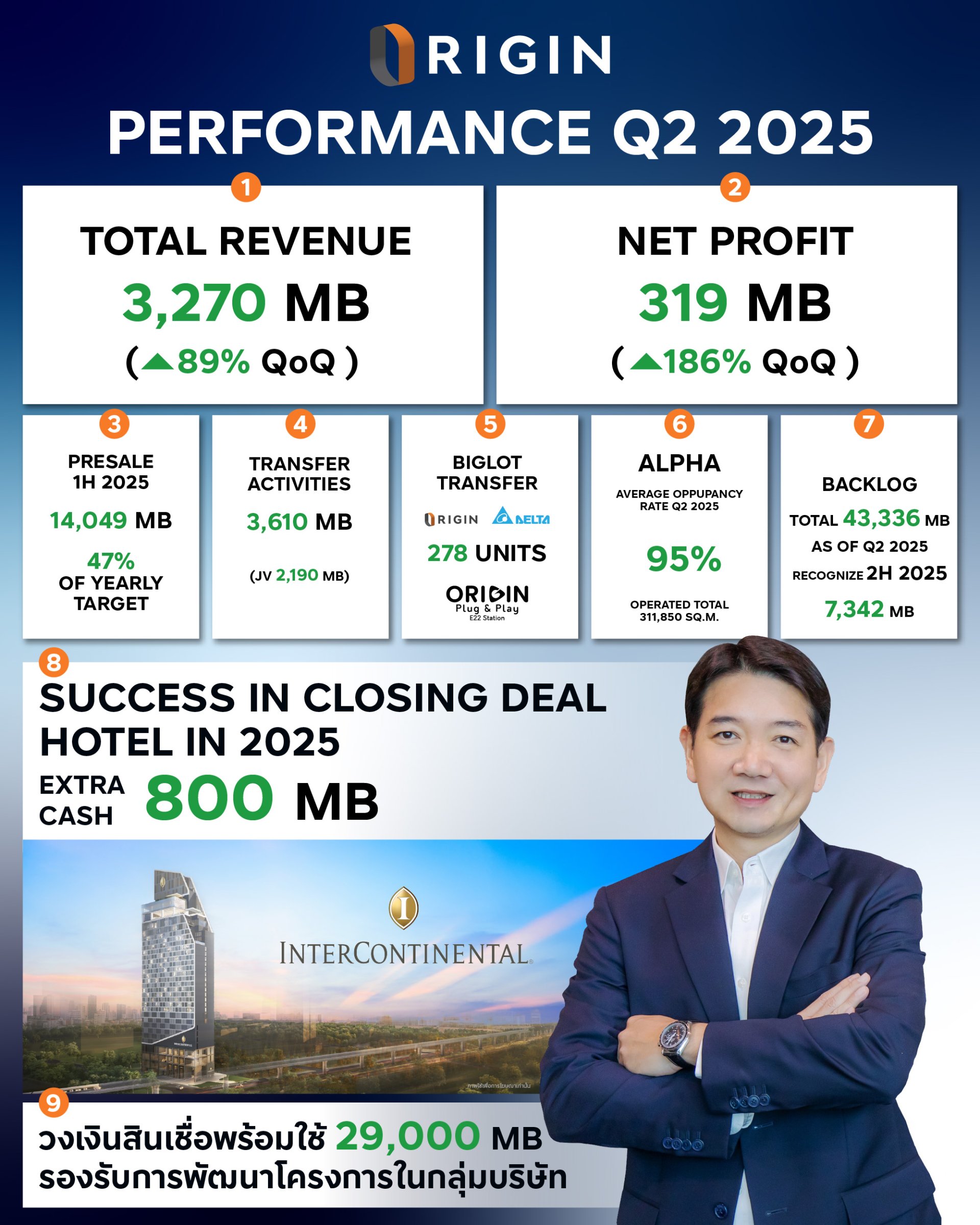 นายพีระพงศ์ จรูญเอก ประธานเจ้าหน้าที่บริหาร บริษัท ออริจิ้น พร็อพเพอร์ตี้ จำกัด (มหาชน) หรือ ORI ผู้พัฒนาธุรกิจอสังหาริมทรัพย์ครบวงจร กล่าวว่า ผลการดำเนินงานในไตรมาส 2 ปี 2568 บริษัทฯ มีรายได้จากการโอนกรรมสิทธิ์โครงการที่อยู่อาศัยทุกกลุ่ม (รวมโครงการ JV) ทั้งสิ้นกว่า 3,610 ล้านบาท โดยแบ่งเป็นโครงการที่บริษัทฯพัฒนา (Non-JV) 2,190 ล้านบาท และโครงการร่วมทุน (JV) 1,420 ล้านบาท ส่งผลให้มีกำไรสุทธิไตรมาส 2 ปี 2568 จำนวน 319 ล้านบาท เพิ่มขึ้นกว่า 3 เท่า เมื่อเทียบกับไตรมาสก่อนหน้า (QoQ)