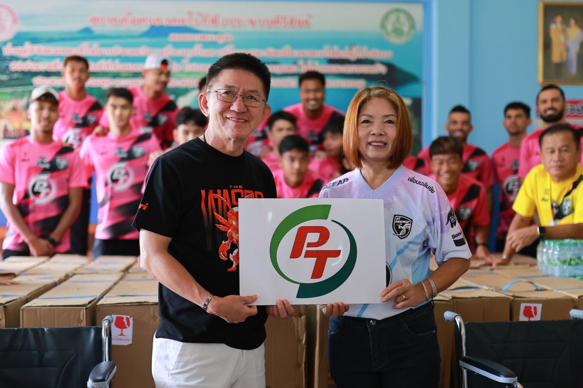 นายฉลอง ติรไตรภูษิต ผู้อำนวยการฝ่ายสื่อสารองค์กร บริษัท พีทีจี เอ็นเนอยี จำกัด (มหาชน) หรือ PTG ผู้สนับสนุนหลักสโมสรฟุตบอล พีที ประจวบ เอฟซี พร้อมด้วยนักฟุตบอลและสต๊าฟโค้ช ร่วมสร้างรอยยิ้มและแบ่งปันความสุข มอบรถวิลแชร์และของใช้ที่จำเป็นในชีวิตประจำวันรวมถึงจัดเลี้ยงอาหารกลางวันให้แก่ผู้รับการสงเคราะห์ภายในสถานคุ้มครองคนไร้ที่พึ่งประจวบคีรีขันธ์ (บ้านประจวบโชค) ต.อ่าวน้อย อ.เมืองประจวบคีรีขันธ์ โดยมีนางไพทิพย์ หนูพรหม ผู้ปกครองสถานคุ้มครองคนไร้ที่พึ่งประจวบคีรีขันธ์ สถานคุ้มครองคนไร้ที่พึ่งประจวบคีรีขันธ์ เป็นผู้รับมอบ ปัจจุบันมีผู้ป่วยผู้พักพิงภายในบ้านประจวบโชคทั้งสิ้น 427 คน
