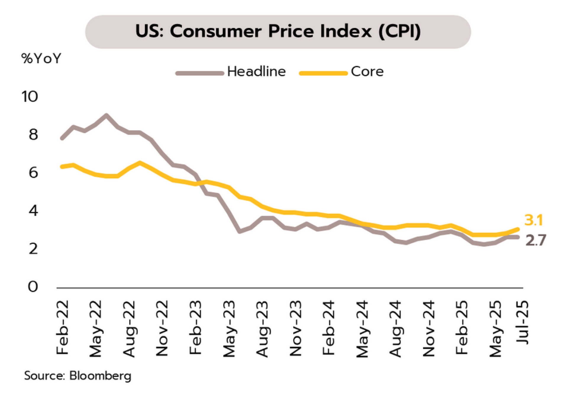 คาดเฟดให้น้ำหนักการชะลอตัวของเศรษฐกิจขึ้น เพิ่มโอกาสปรับลดดอกเบี้ยในช่วงที่เหลือของปี ในเดือนกรกฎาคม อัตราเงินเฟ้อทั่วไปทรงตัวจากเดือนก่อนหน้าที่ 2.7% YoY ส่วนอัตราเงินเฟ้อพื้นฐานขยับขึ้นเล็กน้อยจากเดือนก่อนที่ 2.9% สู่ระดับ 3.1% ใกล้เคียงกับคาดการณ์ของตลาด ขณะที่ยอดค้าปลีกเติบโตจากเดือนก่อน 0.5% ชะลอลงจาก 0.9% ในเดือนมิถุนายน สอดคล้องกับความเชื่อมั่นผู้บริโภคที่ปรับลดลงสู่ระดับต่ำสุดในรอบ 4 เดือนที่ 58.6