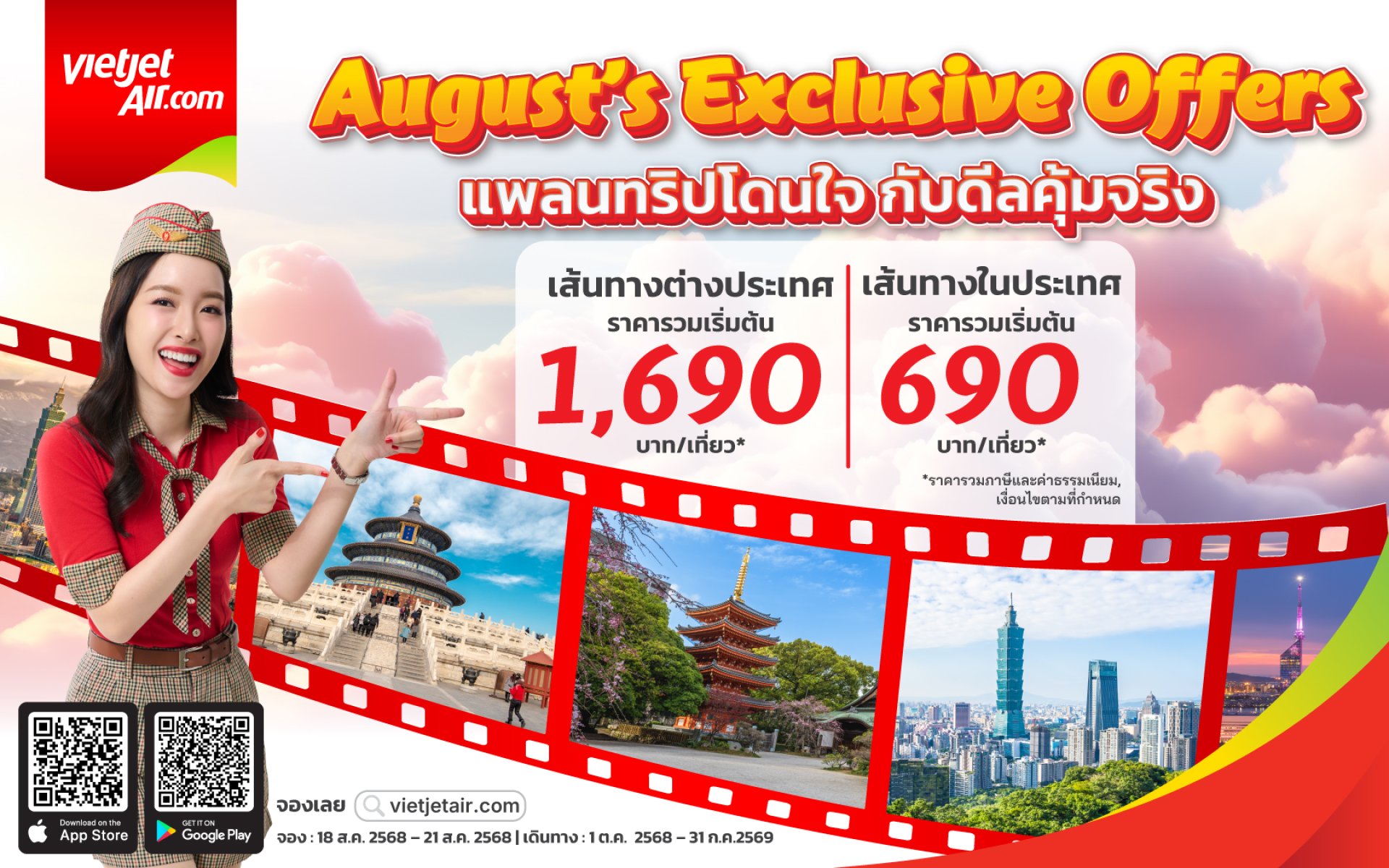 เวียตเจ็ทไทยแลนด์ลดกระหน่ำต้อนรับเดือนสิงหาคม กับโปรโมชั่นพิเศษ แพลนทริปโดนใจ กับดีลคุ้มจริง (Augusts Exclusive Offers) มอบบัตรโดยสารราคาสุดประหยัด เริ่มต้นเพียง 690 บาท (ราคารวมภาษีและค่าธรรมเนียม) สำหรับเส้นทางบินภายในประเทศยอดนิยม อาทิ ภูเก็ต กระบี่ เชียงใหม่ เชียงราย หาดใหญ่ และอีกมากมาย พร้อมบัตรโดยสารระหว่างประเทศราคาเริ่มต้นเพียง 1,690 บาท (ราคารวมภาษีและค่าธรรมเนียม) ครอบคลุมเส้นทางยอดฮิต อาทิ ไทเป ฟูกุโอกะ ฟูโกว๊ก ปักกิ่ง เซี่ยงไฮ้ รวมถึงเส้นทางยอดนิยมทั่วเอเชีย จองได้ระหว่างวันที่ 18 21 สิงหาคม 2568 ใช้สำหรับเดินทางระหว่างวันที่ 1 ตุลาคม 2568 31 กรกฎาคม 2569 (ยกเว้นวันหยุดนักขัตฤกษ์) รีบจองเลยวันนี้ที่ www.vietjetair.com