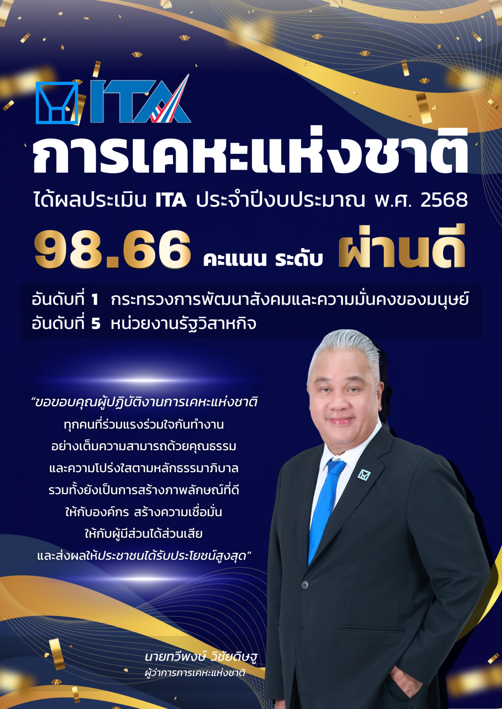 นายทวีพงษ์ วิชัยดิษฐ ผู้ว่าการการเคหะแห่งชาติ เปิดเผยว่า สำนักงานคณะกรรมการป้องกันและปราบปรามการทุจริตแห่งชาติ (ป.ป.ช.) โดยสำนักประเมินคุณธรรมและความโปร่งใสได้ประกาศผลการประเมินคุณธรรมและความโปร่งใสในการดำเนินงานของหน่วยงานภาครัฐ (Integrity and Transparency Assessment : ITA) ประจำปีงบประมาณ 2568 ซึ่งการเคหะแห่งชาติได้รับคะแนน 98.66 จาก 100 คะแนน เพิ่มขึ้นจากปี 2567 ที่ได้ 96.44 คะแนน หรือเพิ่มขึ้น 2.22 คะแนน อยู่ในระดับ ผ่านดี