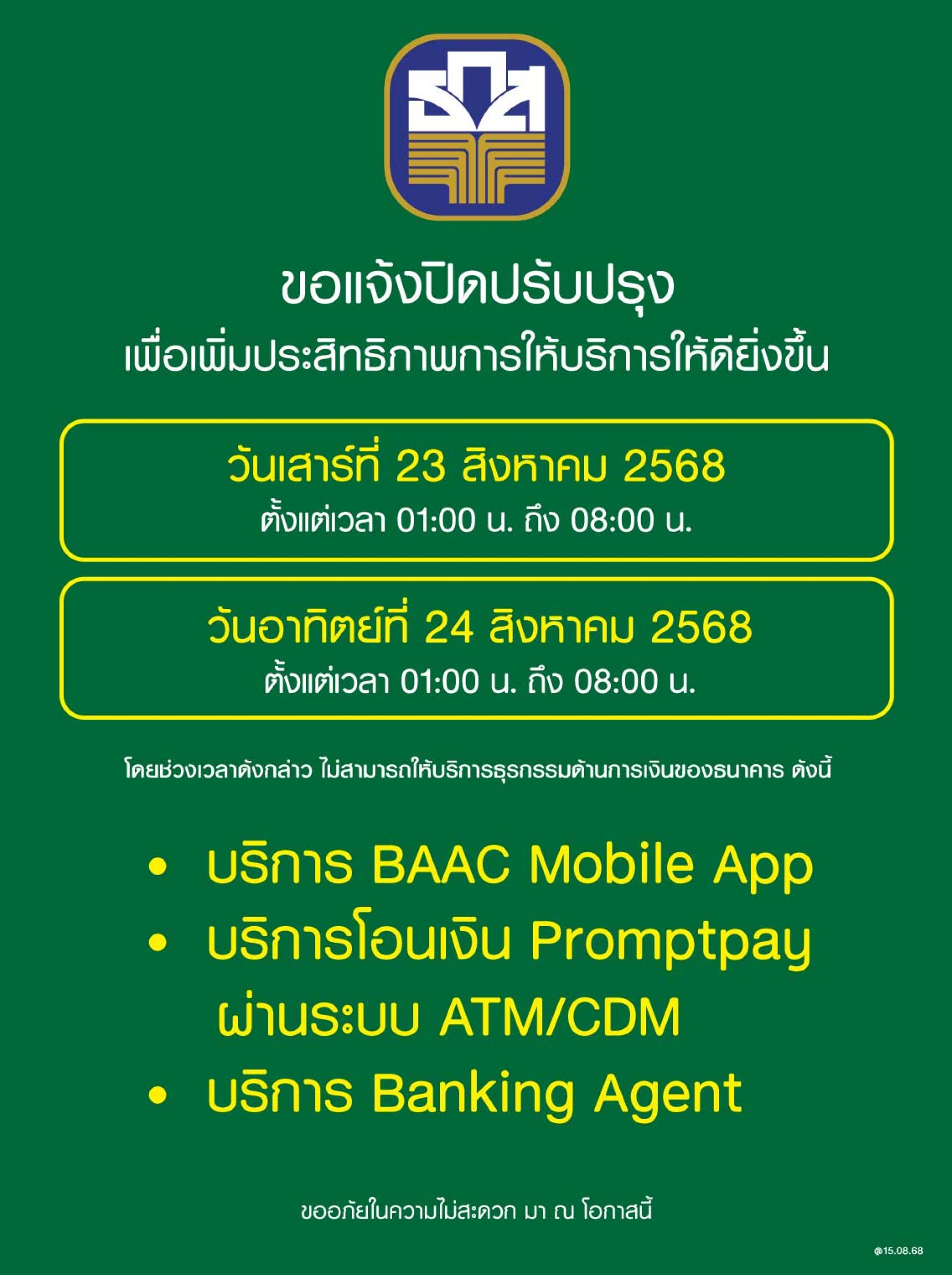 ตั้งแต่เวลา 01:00 น. ถึงเวลา 08:00 น. รวมเวลาหยุดให้บริการ 7 ชั่วโมงและในวันอาทิตย์ที่ 24 สิงหาคม 2568 ตั้งแต่เวลา 01:00 น. ถึงเวลา 08:00 น. รวมเวลาหยุดให้บริการ 7 ชั่วโมง โดยช่วงเวลาดังกล่าว ลูกค้าธนาคารไม่สามารถทำธุรกรรมด้านการเงินทั้งหมดผ่านระบบ BAAC Mobile ได้ ส่วนลูกค้าที่ใช้ระบบ ATM/CDM จะไม่สามารถโอนเงิน และลงทะเบียน Promptpay รวมถึงชำระบิลผ่านตู้ ATM ได้ในช่วงเวลาดังกล่าว ธ.ก.ส. ขอขอบพระคุณลูกค้าผู้ใช้บริการทุกท่าน และ