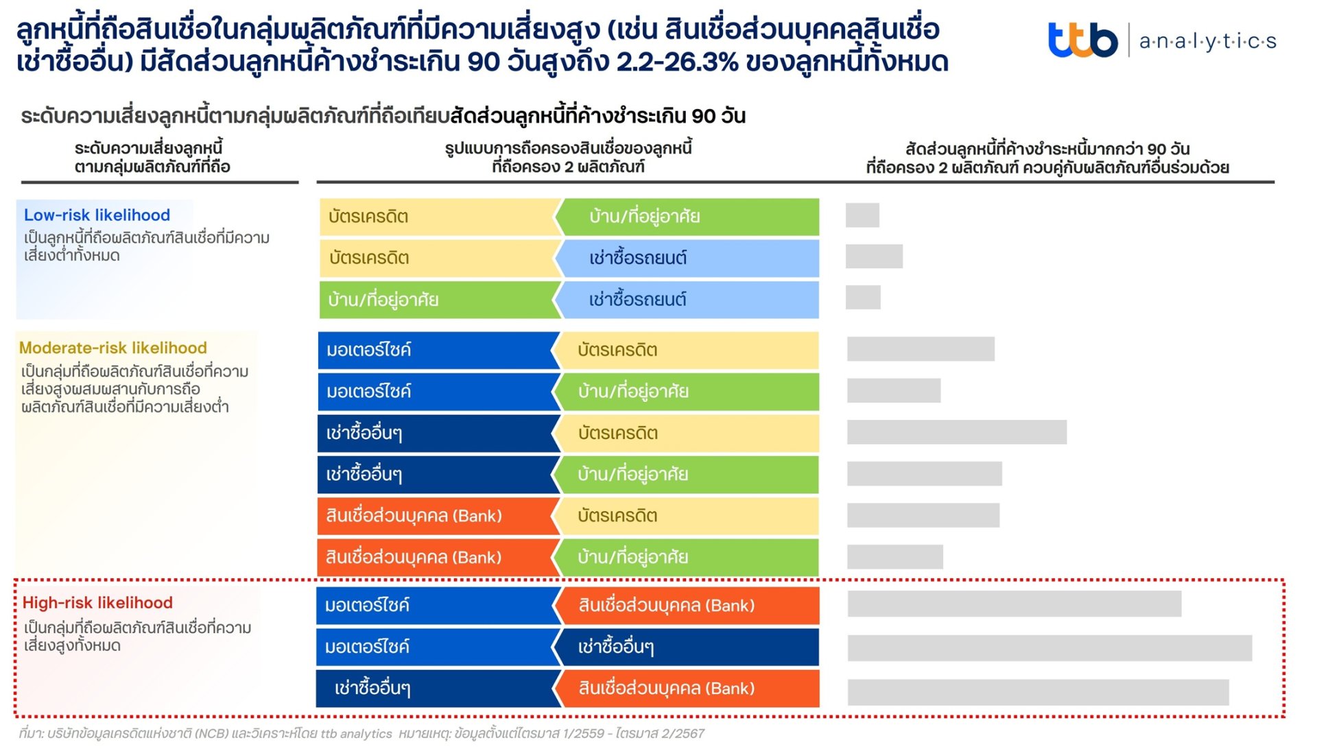จากข้อมูลดังกล่าว ttb analytics ได้ประเมินพฤติกรรมของลูกหนี้ที่มีแนวโน้มผิดนัดชำระหนี้ในเบื้องต้นตามการถือและลำดับการถือผลิตภัณฑ์สินเชื่อ โดยจำแนกตามกลุ่มความเสี่ยงตามลักษณะของผลิตภัณฑ์ ซึ่งแบ่งออกเป็น 2 ประเภท ได้แก่ 1) ผลิตภัณฑ์สินเชื่อที่มีหลักประกันหรือมีความเสี่ยงในการผิดนัดชำระหนี้ค่อนข้างต่ำ ได้แก่ สินเชื่อบ้าน สินเชื่อเช่าซื้อรถยนต์ และสินเชื่อบัตรเครดิต และ 2) ผลิตภัณฑ์สินเชื่อที่ไม่มีหลักประกันหรือมีความเสี่ยงในการผิดนัดชำระหนี้ค่อนข้างสูง ได้แก่ สินเชื่อมอเตอร์ไซค์ สินเชื่อส่วนบุคคล และสินเชื่อเช่าซื้ออื่น ๆ (เช่น สินเชื่อเพื่อซื้อโทรศัพท์มือถือและเครื่องใช้ไฟฟ้า) ซึ่งแบ่งออกเป็น 3 กลุ่มดังนี้