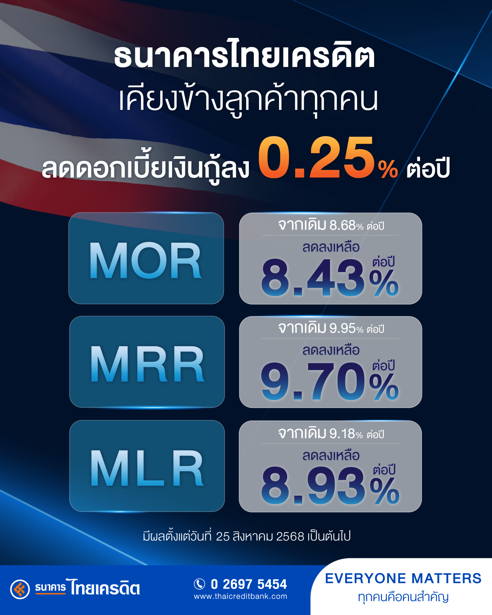 ธนาคารไทยเครดิต จำกัด (มหาชน) ประกาศปรับลดอัตราดอกเบี้ยเงินกู้ลง0.25% ต่อปี มีผลตั้งแต่วันที่ 25 สิงหาคม 2568 เป็นต้นไป สอดคล้องตามมติของคณะกรรมการนโยบายการเงิน (กนง.) เพื่อเพิ่มสภาพคล่องทางการเงินของลูกค้าที่ได้รับผลกระทบในด้านภาระต้นทุนทางการเงินที่สูงขึ้นในสถานการณ์เศรษฐกิจที่มีแนวโน้มชะลอตัวในครึ่งปีหลัง