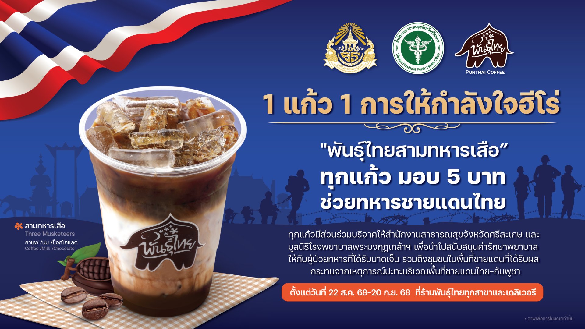 กาแฟพันธุ์ไทยร่วมสนับสนุนทหารแนวรบชายแดนผู้เสียสละ กับโครงการ "1 แก้ว 1 การให้กำลังใจฮีโร่" โดยทุกการสั่งซื้อเมนู 'สามทหารเสือ' 1 แก้ว ลูกค้าจะมีส่วนร่วมในการบริจาคเงิน 5 บาท ให้แก่สำนักงานสาธารณสุขจังหวัดศรีสะเกษ และ โรงพยาบาลพระมงกุฎเกล้าในพระราชูปถัมภ์ สมเด็จพระเทพรัตนราชสุดาฯ สยามบรมราชกุมารี เพื่อนำไปสนับสนุนค่ารักษาพยาบาล จัดหาอุปกรณ์ทางการแพทย์ เวชภัณฑ์ และเครื่องมือแพทย์ที่จำเป็นและทันสมัย พร้อมเพิ่มประสิทธิภาพการรักษาให้กับผู้ป่วยทหารที่ได้รับบาดเจ็บจากการปฏิบัติหน้าที่ในเหตุปะทะบริเวณพื้นที่ชายแดนไทย กัมพูชา ตั้งแต่วันที่ 22 สิงหาคม 2568 - 20 กันยายน2568 ที่ร้านกาแฟพันธุ์ไทยทุกสาขาที่ร่วมรายการ และ บริการเดลิเวอรีจัดส่งถึงบ้าน
