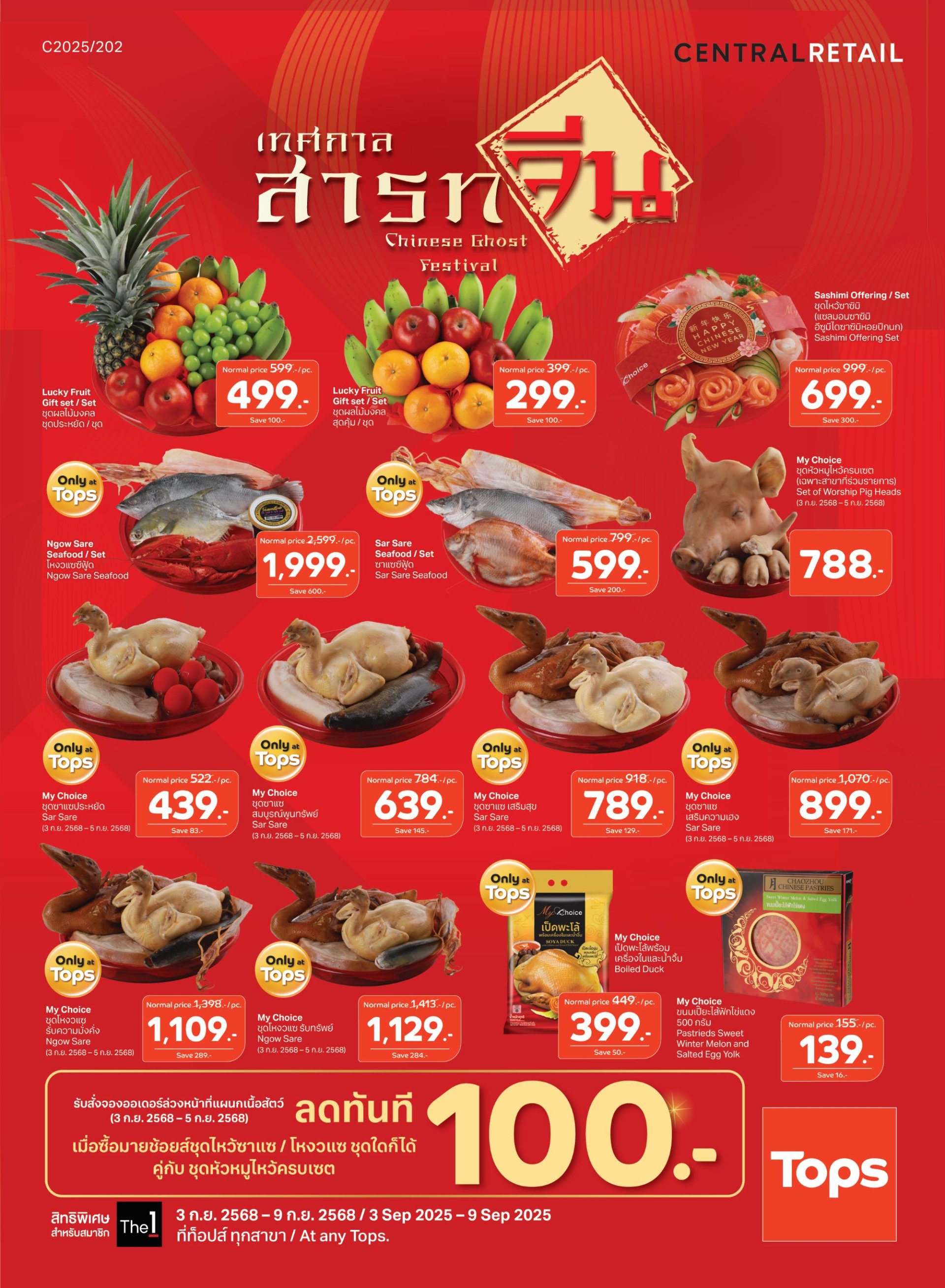 ท็อปส์ ธุรกิจกลุ่มฟู้ด ในเครือเซ็นทรัล รีเทล ร่วมต้อนรับเทศกาลสำคัญของลูกหลานเชื้อสายจีน จัดงาน เทศกาลสารทจีน คัดชุดไหว้เสริมมงคล ครบครันด้วยสินค้าของไหว้คุณภาพพรีเมียมรวมกว่า 350 รายการ การันตีคุณภาพและความสดใหม่ และถูกต้องตามขนบธรรมเนียม อาทิ มายช้อยส์ ชุดโหงวแซรับความมั่งคั่ง, มายช้อยส์ ชุดซาแซเสริมสุข, มายช้อยส์ หัวหมูไหว้ครบเซต, ชุดโหงวแซซีฟู้ด, ชุดซาแซซีฟู้ด, ไก่สาวต้ม, ชุดไหว้ซาซิมิ, ชุดผลไม้มงคล, ขนมมงคล พร้อมด้วยสินค้าของไหว้ อาทิ ชุดกระดาษไหว้เจ้า, ชุดกระดาษไหว้บรรพบุรุษ และของไหว้คุณภาพอีกมากมาย พิเศษรับฟรี! บัตรของขวัญ TOPS มูลค่า 100 บาท เมื่อสั่งจองชุดไหว้ที่ร่วมรายการครบ 800 บาท/ใบเสร็จ ตั้งแต่วันนี้ 2 กันยายน 2568 ที่ท็อปส์ และท็อปส์ ฟู้ด ฮอลล์ ทุกสาขา หรือช้อปผ่าน ท็อปส์ ออนไลน์ หรือ บริการผู้ช่วยช้อปส่วนตัว (Personal Shopper) และสามารถเลือกช้อปด้วยตัวเองได้พร้อมกันทุกสาขา ในวันที่ 3 9 กันยายน 2568 ติดตามข้อมูลเพิ่มเติมได้ที่ www.tops.co.th, เฟซบุ๊ก TOPS Thailand, หรือแอปพลิเคชันไลน์ @TOPSThailand