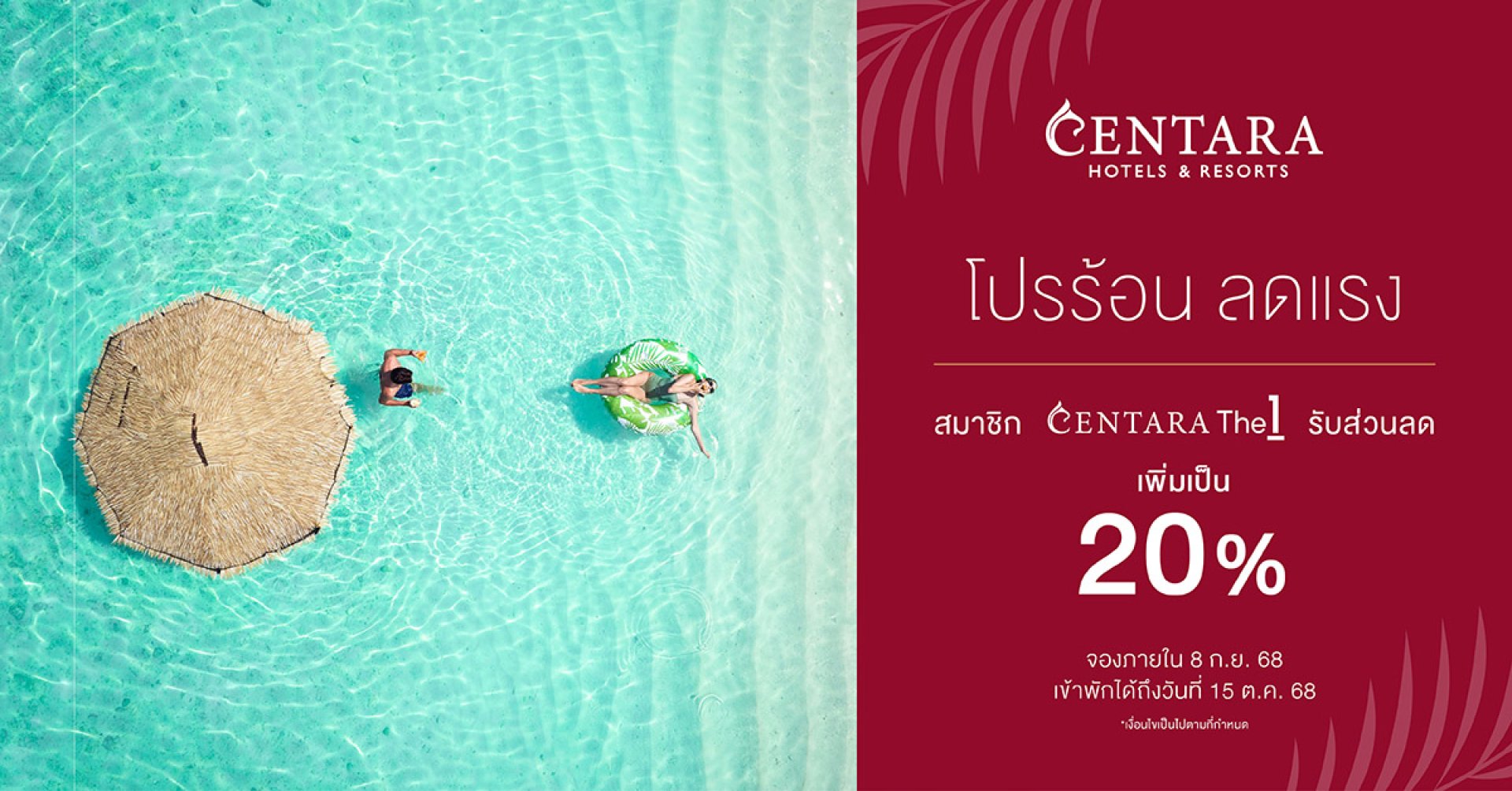 โดยสำหรับความโดดเด่นของโปรโมชั่นนี้ คือการที่สมาชิก CentaraThe1 จะได้รับส่วนลดสูงถึง 20% (จากปกติ 15%) สำหรับราคาและโปรโมชั่นที่ร่วมรายการ เมื่อทำการจองห้องพัก ณ โรงแรมและรีสอร์ทในเครือ ระหว่างวันที่ 25 สิงหาคม 8 กันยายน 2568 เพื่อเข้าพักภายในวันที่ 31 ตุลาคม 2568 นี้